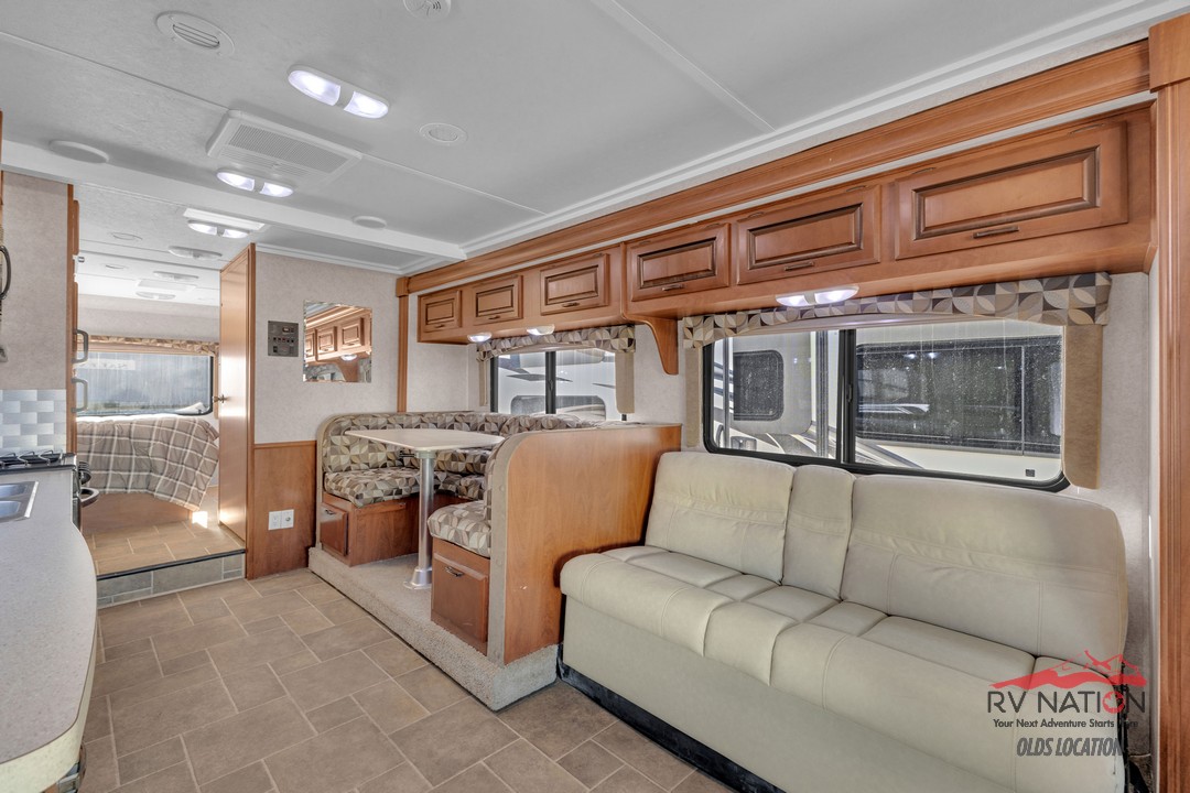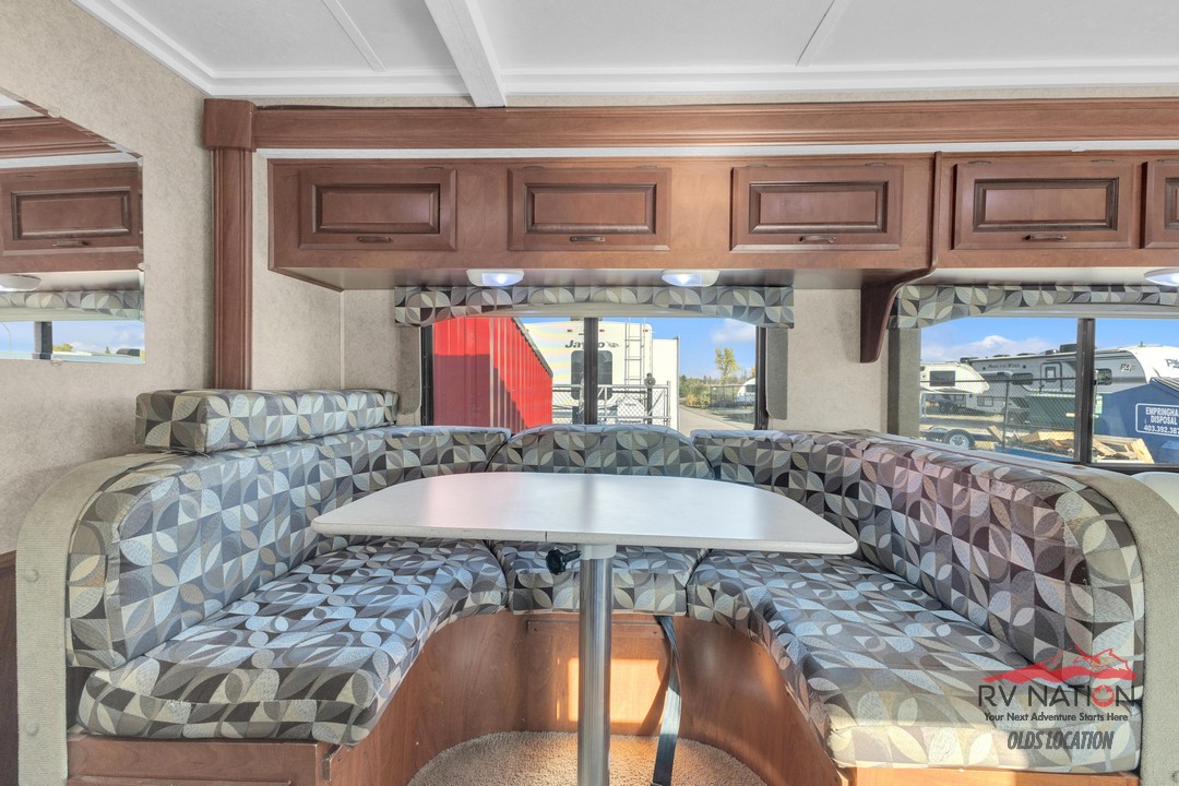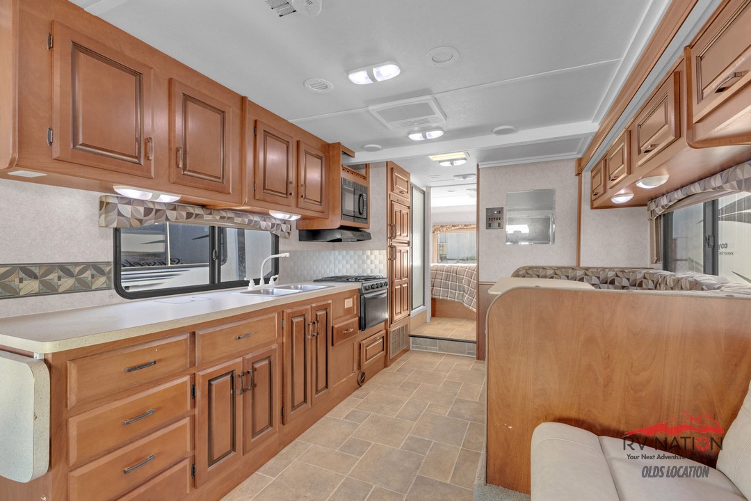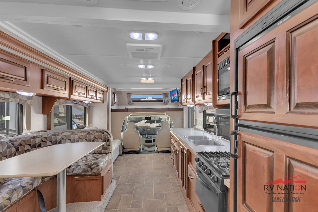 This model features a spacious cab-over bunk and comfortable sofa that convert into a rear bunk and a large booth dinette—sleeping up to six comfortably. The well-equipped kitchen includes a three-burner stove, oven, microwave, and a mid-size refrigerator.
