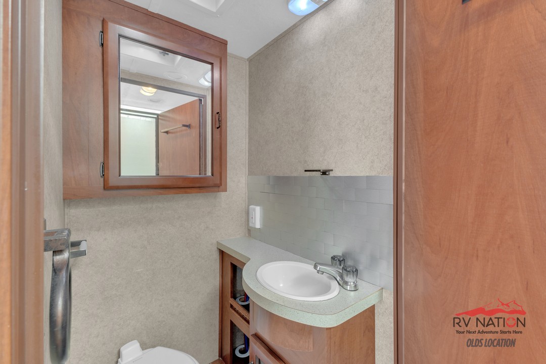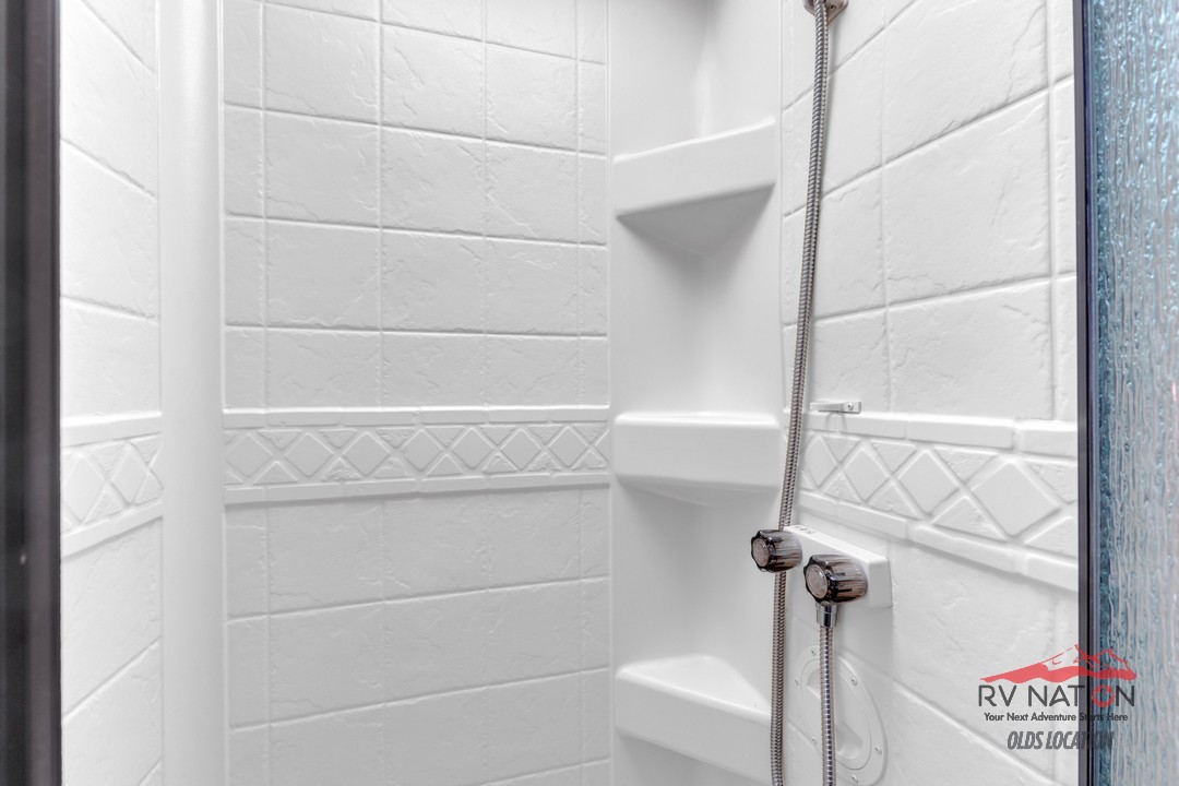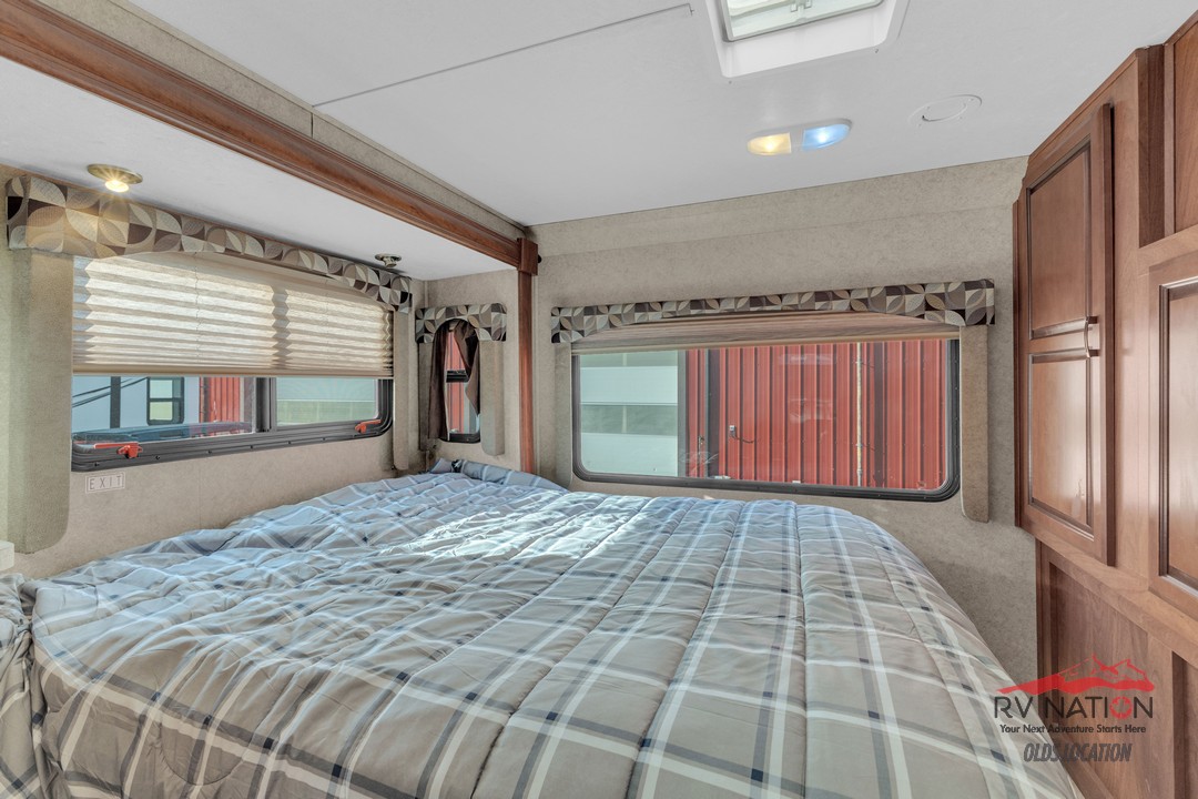 A full bathroom with shower, toilet, and sink ensures on-the-road convenience, while the queen bed in the rear slide-out offers a private sleeping retreat. Additional highlights include a 12-ft power awning with LED lighting, plenty of exterior storage.