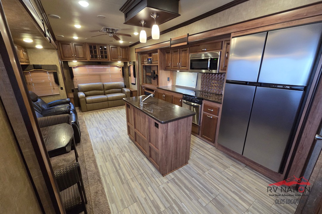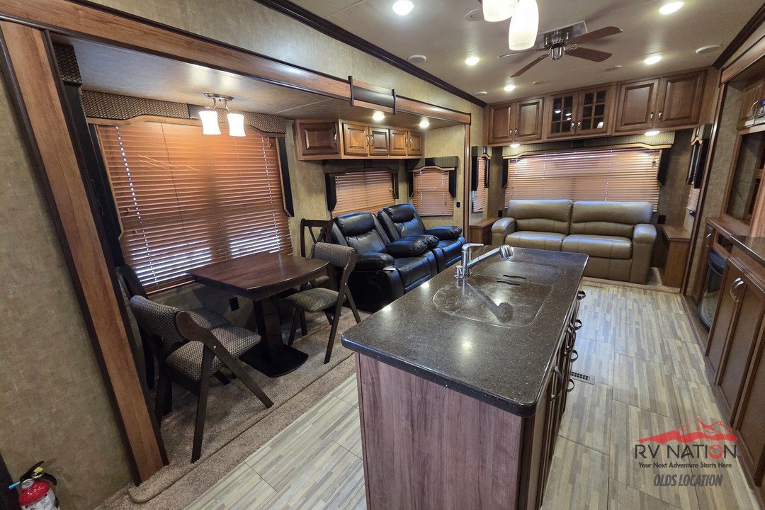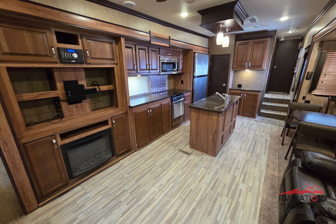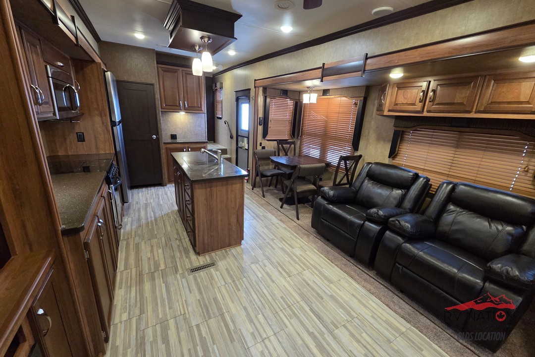 The 2017 Durango Gold G370RLT is a premium fifth wheel that combines upscale comfort with well-thought-out functionality. Its rear-living layout features abundant seating, a large entertainment area, and plenty of natural light, creating a welcoming space for relaxing or hosting friends and family. The centrally located kitchen offers solid-surface countertops, a three-burner cooktop with oven, a roomy refrigerator, and generous storage, making meal prep easy and enjoyable on long trips.