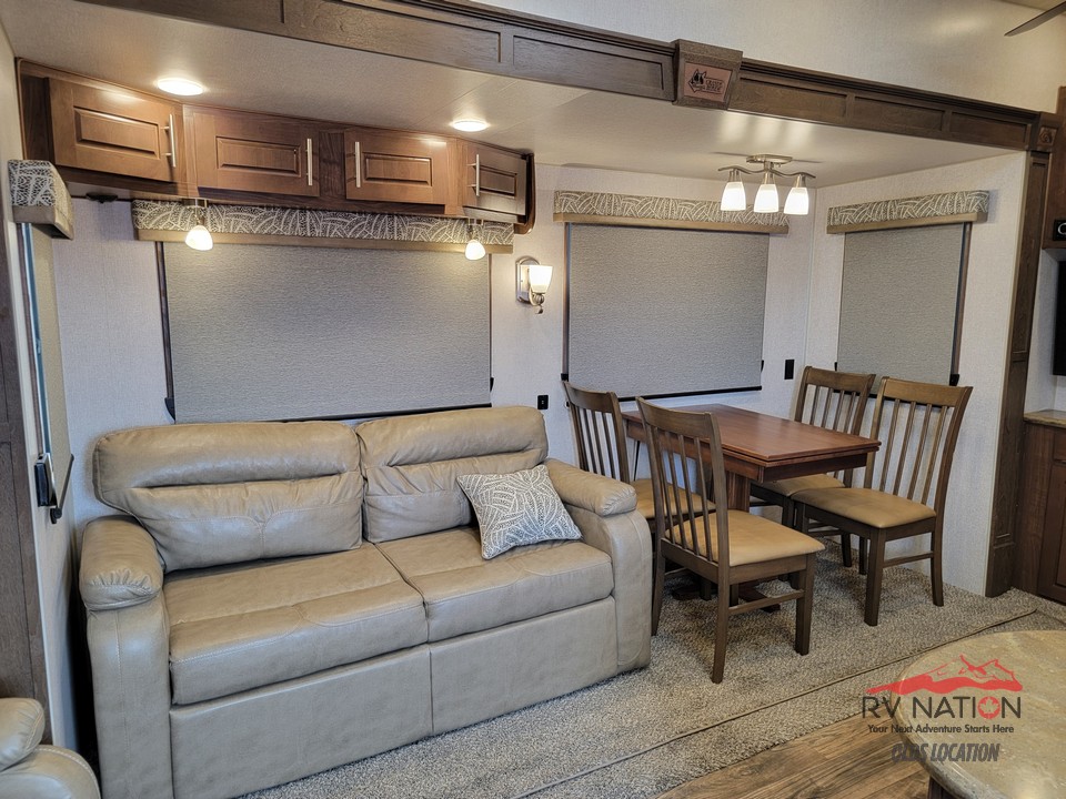 The 2023 Arctic Fox 29-5T is a true four-season fifth wheel, built on Northwood’s legendary quality and designed for extended comfort wherever your travels take you. At just over 34 feet, this dual-slide floorplan offers a spacious rear living layout with two recliner rocker chairs, a tri-fold sofa, and a free-standing dinette. The front bedroom features a walk-around queen bed with wardrobe slide, while the centrally located kitchen includes solid-surface countertops and a four-door propane/electric refrigerator for extended trips.