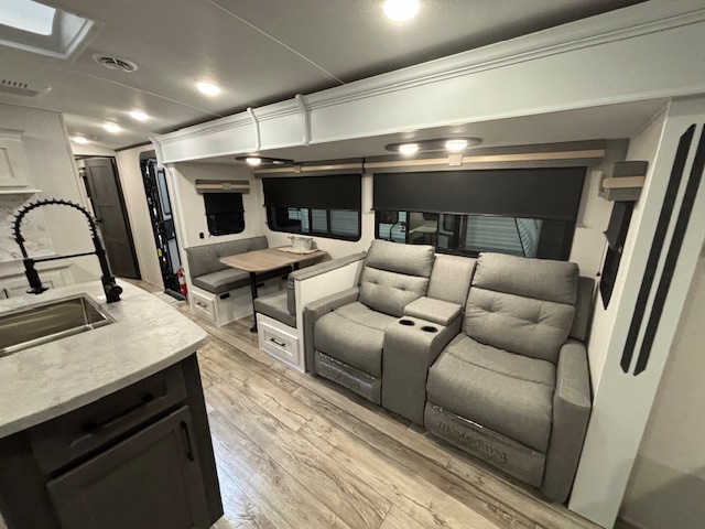 This spacious unit features a front private bedroom with a king bed, a central living area with theater seating and a tri-fold sofa, and a fully equipped kitchen with a kitchen island, stainless steel appliances, and a 10 cu. ft. 12V refrigerator. The rear living area boasts panoramic windows, allowing you to enjoy the view from the comfort of your sofa.