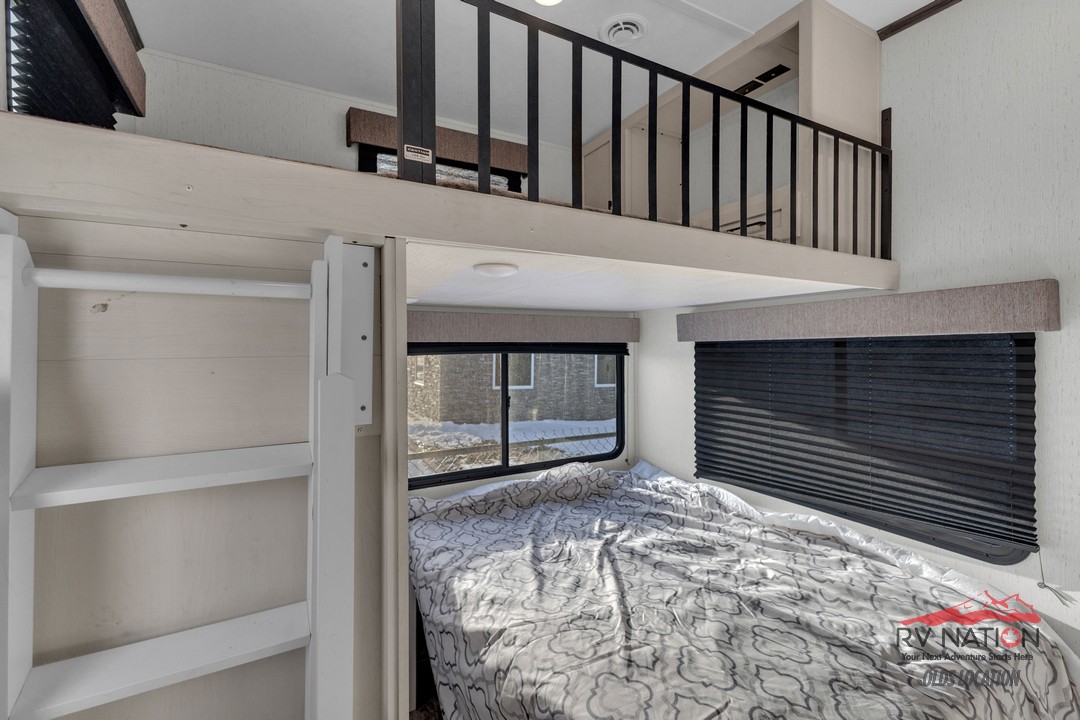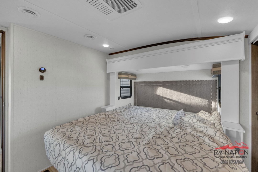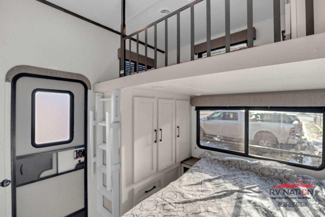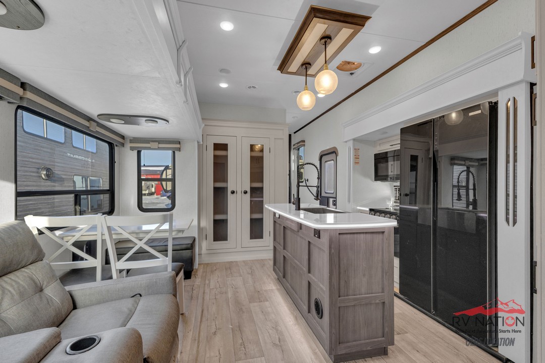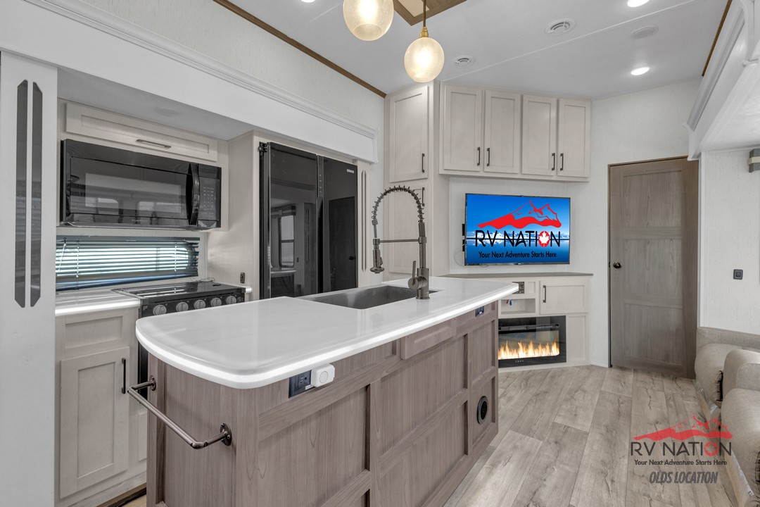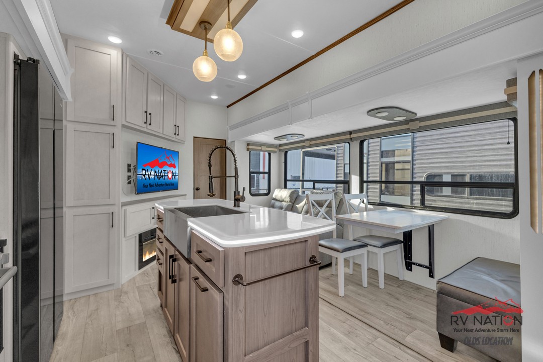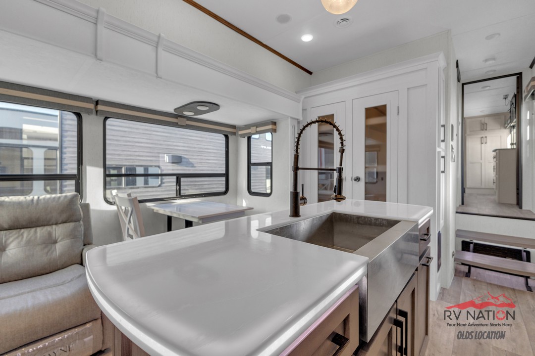 This well-appointed unit features a private rear bedroom with a king bed, a cozy loft above for added sleeping or storage space, and a central living area with theater seating, a tri-fold sofa, and a booth dinette — perfect for relaxing or entertaining. The centrally located kitchen offers stainless steel appliances, a large island, solid-surface countertops, and ample storage for all your culinary needs.