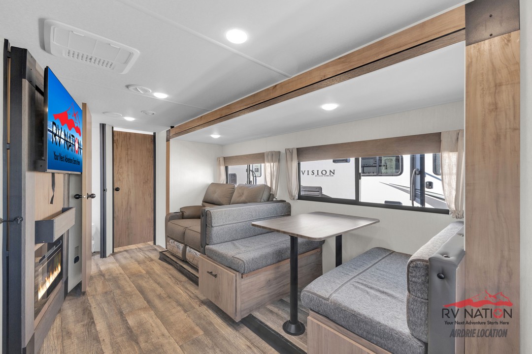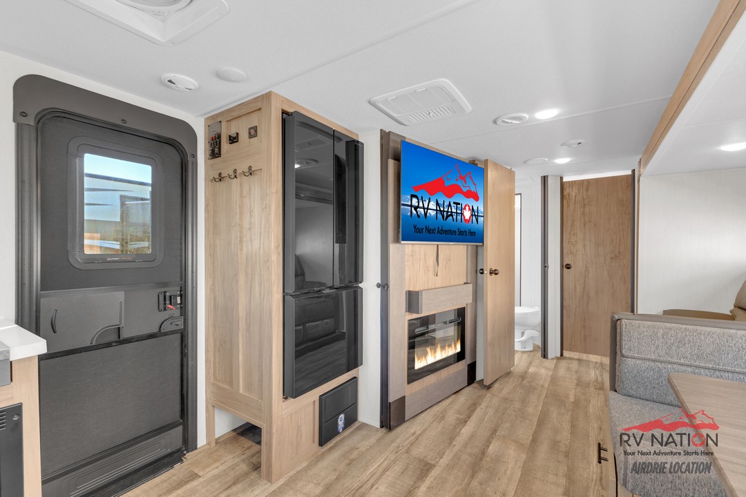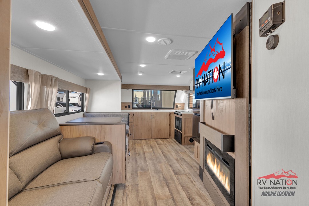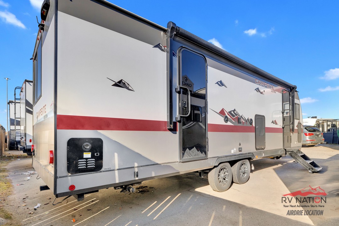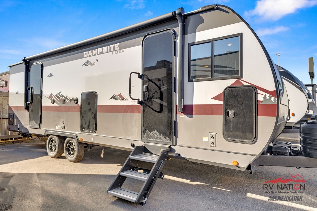 The 2025 Campsite Ultra 26BW delivers upscale comfort in a well‑balanced 30-foot package. With a front-facing kitchen bathed in natural light from a massive automotive-style windshield, it’s designed to thrill the camp chef. A hidden pantry tucked behind the entertainment center adds clever storage, while dual-entry doors provide flexible access throughout the unit. A pair of slides—one under the king bed—expands the living space and bedroom dramatically, making daily life feel roomy and refined.