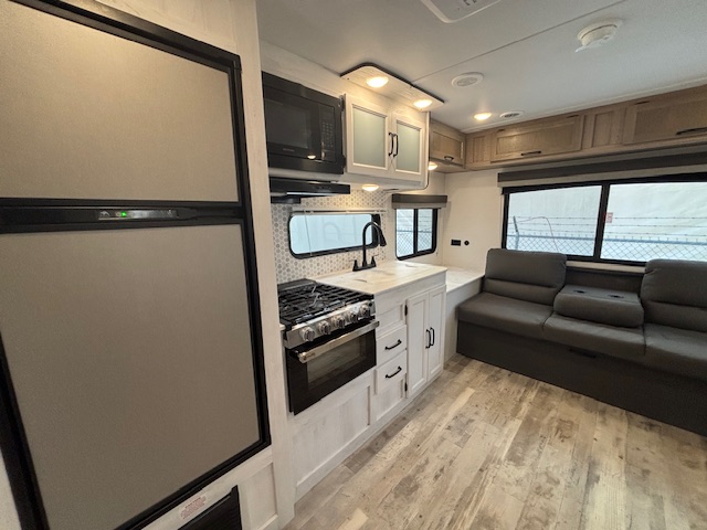 This well-appointed unit features a rear living area with a jackknife sofa and a booth dinette slide-out, providing ample space for relaxation and dining. The central kitchen is equipped with a three-burner range, oven, microwave, and a 6 cu. ft. two-door refrigerator, making meal preparation a breeze.
