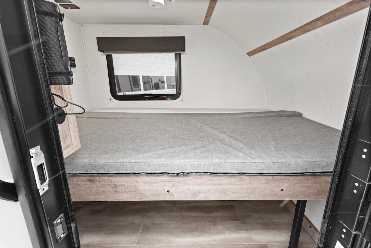 This lightweight trailer features a 76" x 54" RV queen bed with overhead cabinets. It includes a fully equipped outdoor kitchen, perfect for cooking on the go. There is no bathroom, keeping the design simple and efficient for outdoor enthusiasts.