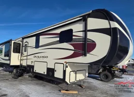 Underneath, it’s true four-season ready thanks to a heavy-duty Ironhorse chassis, thick-wall aluminum frame, high-density insulation, and heated holding tanks for cold-weather durability. The modern kitchen includes solid-surface countertops, a 10 cu ft 12V fridge, and lots of storage, while high-end touches like thermal-pane windows and 50-amp service add up to premium build quality. With fresh water capacity of 88 gallons, gray/black tanks sized at 67/65 gallons, and a GVWR of 16,300 lbs, it’s ready for extended trips in comfort and style.