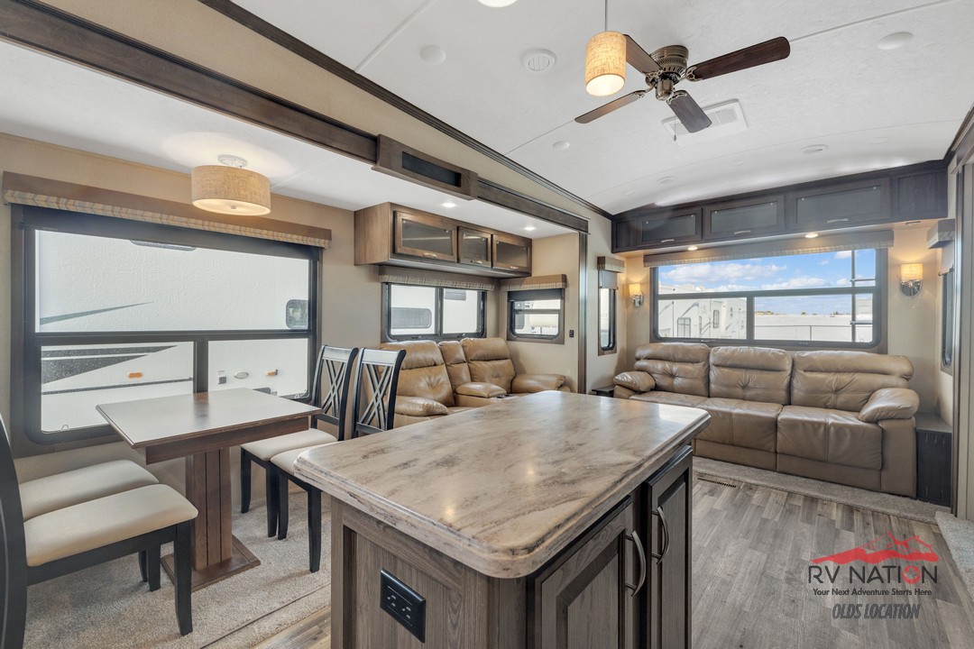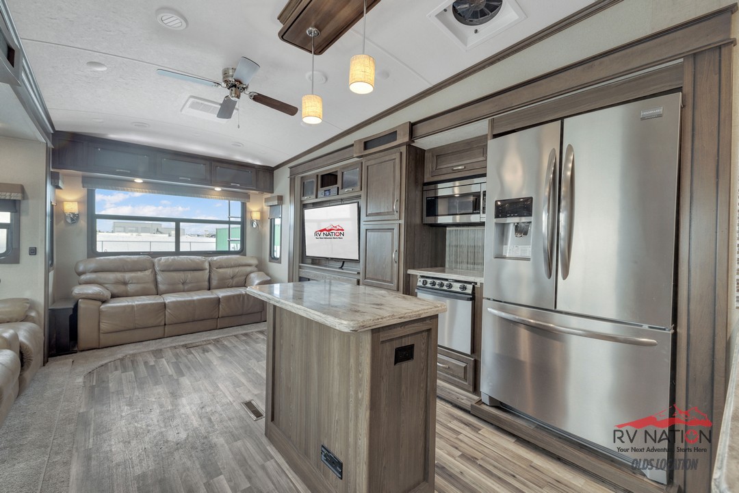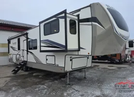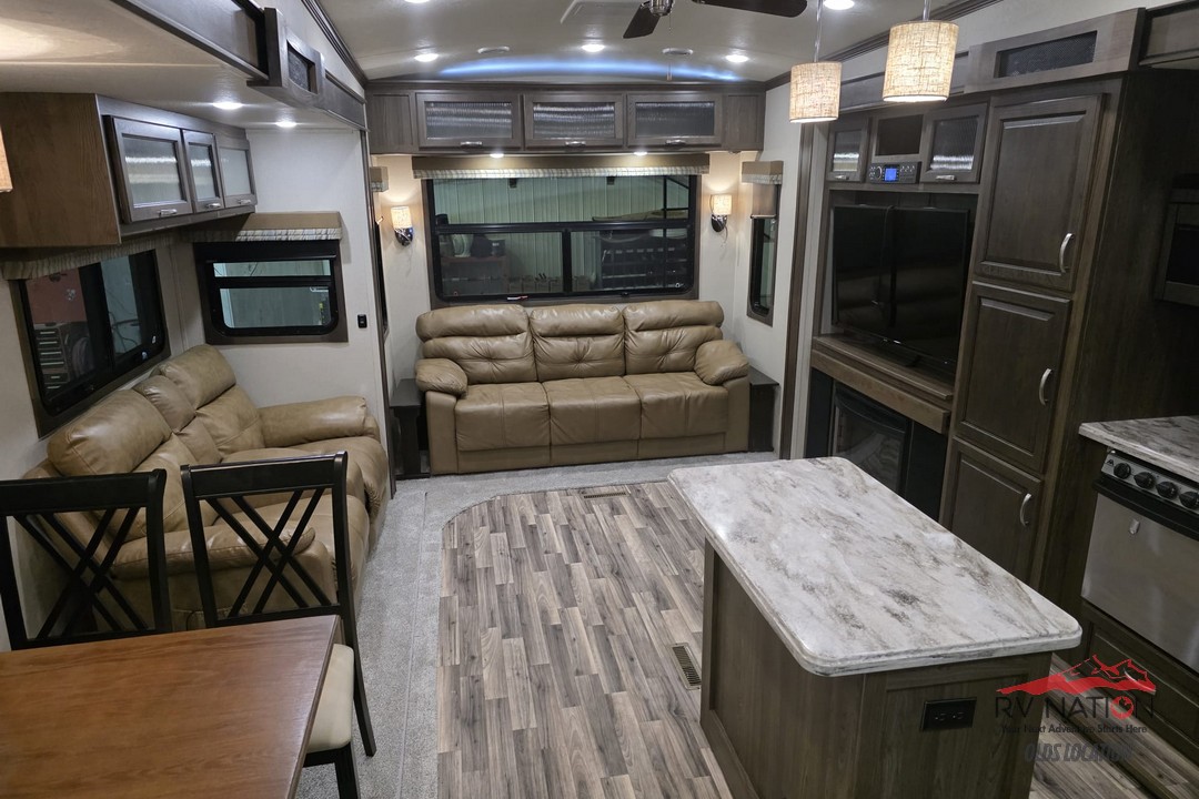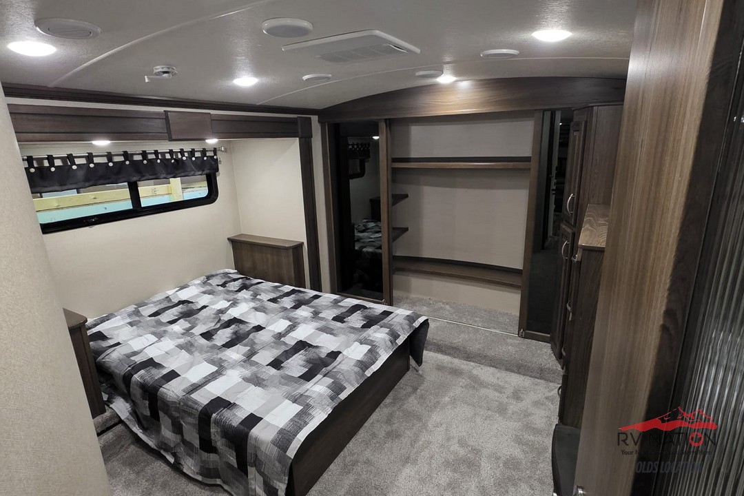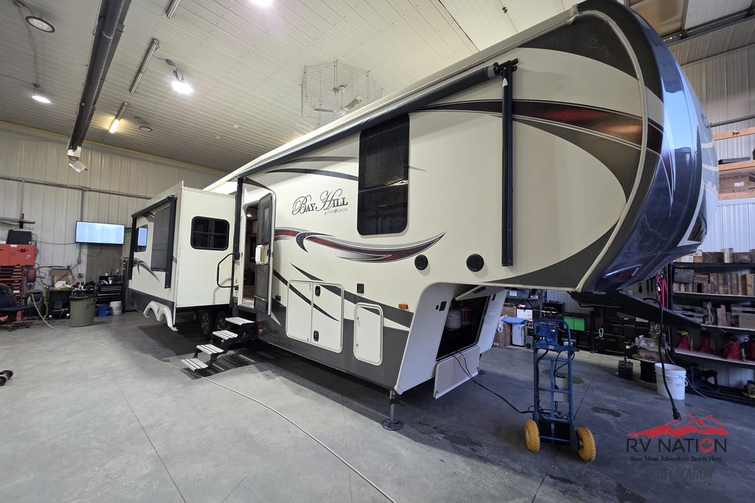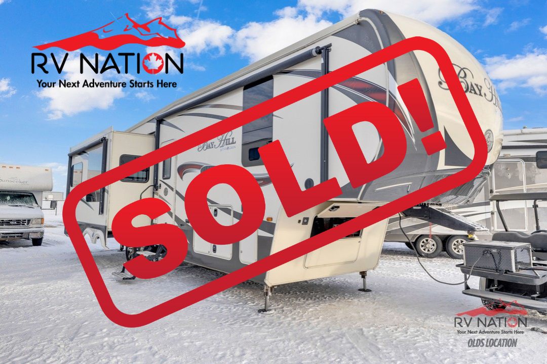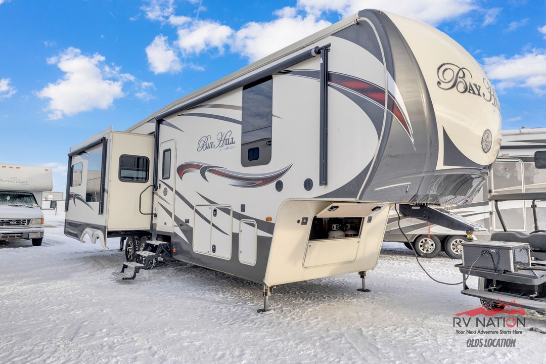 The 2016 Bay Hill 320RS is a roomy fifth wheel designed for extended travel and home-like comfort. With three slide-outs and a well-laid-out rear living area, it offers plenty of space to relax, featuring comfortable seating, abundant storage, and an open floorplan that makes everyday living feel easy. The front bedroom includes a queen bed with wardrobe space, while the central kitchen provides generous counter space, modern appliances, and thoughtful storage.