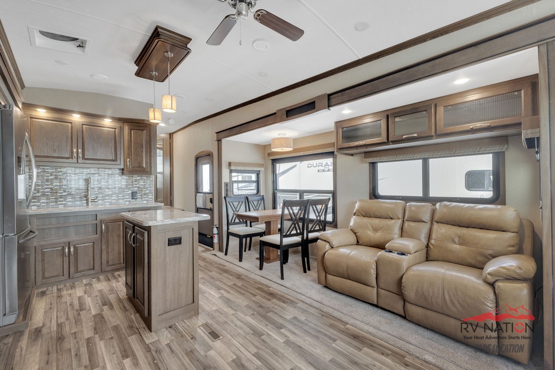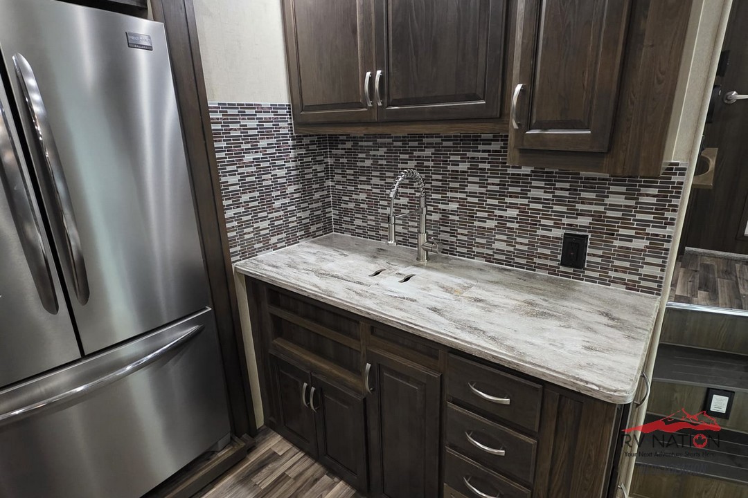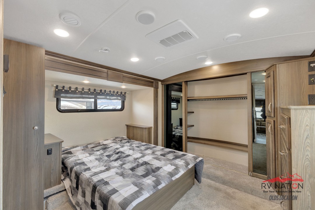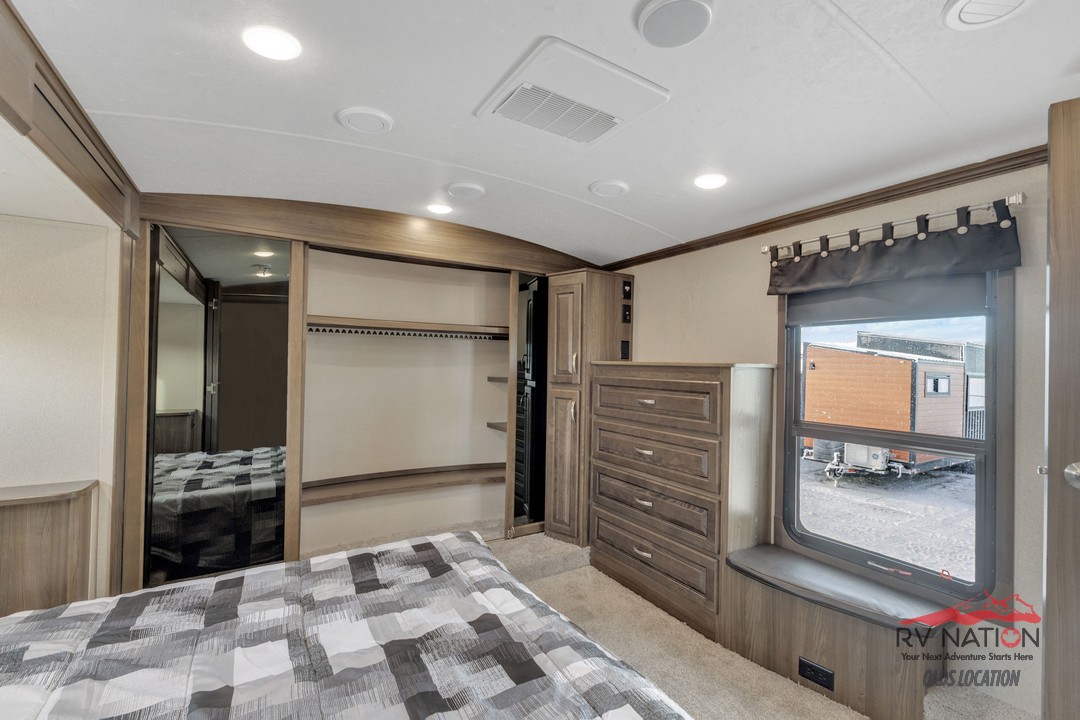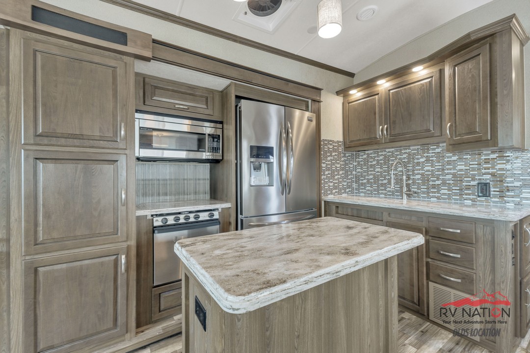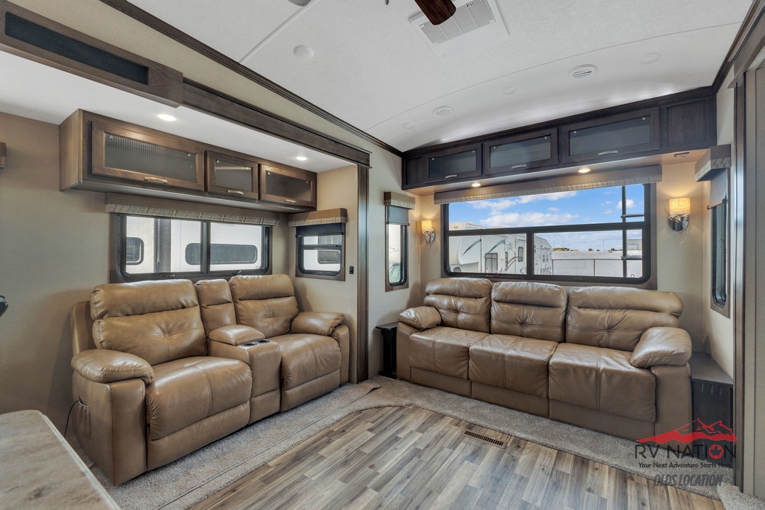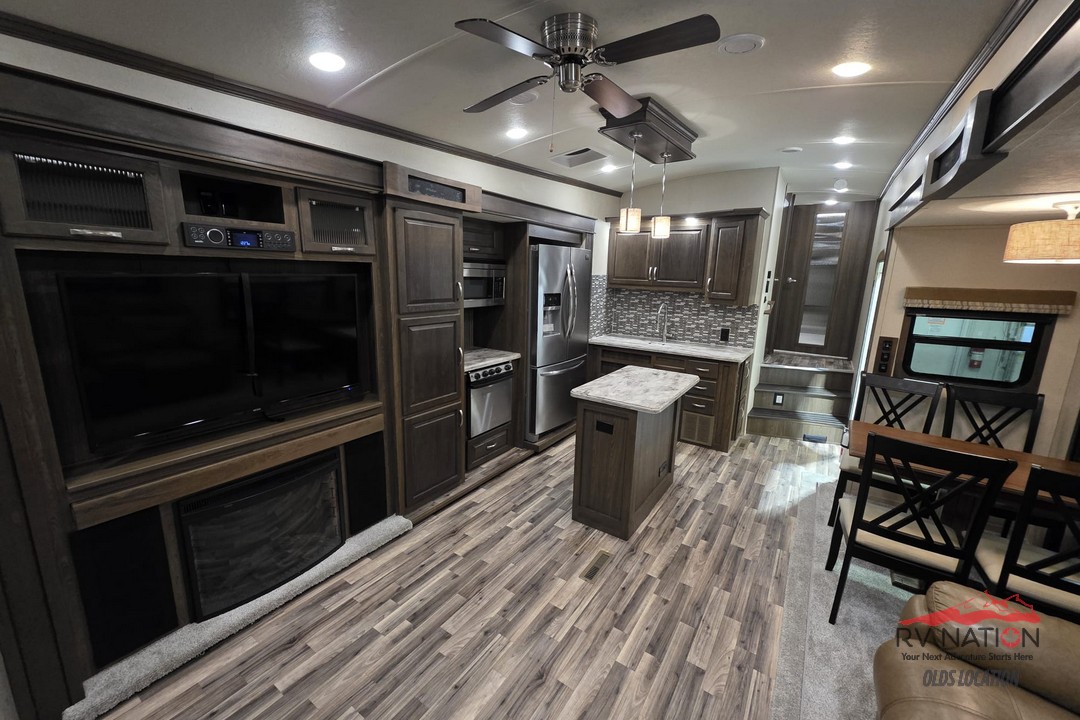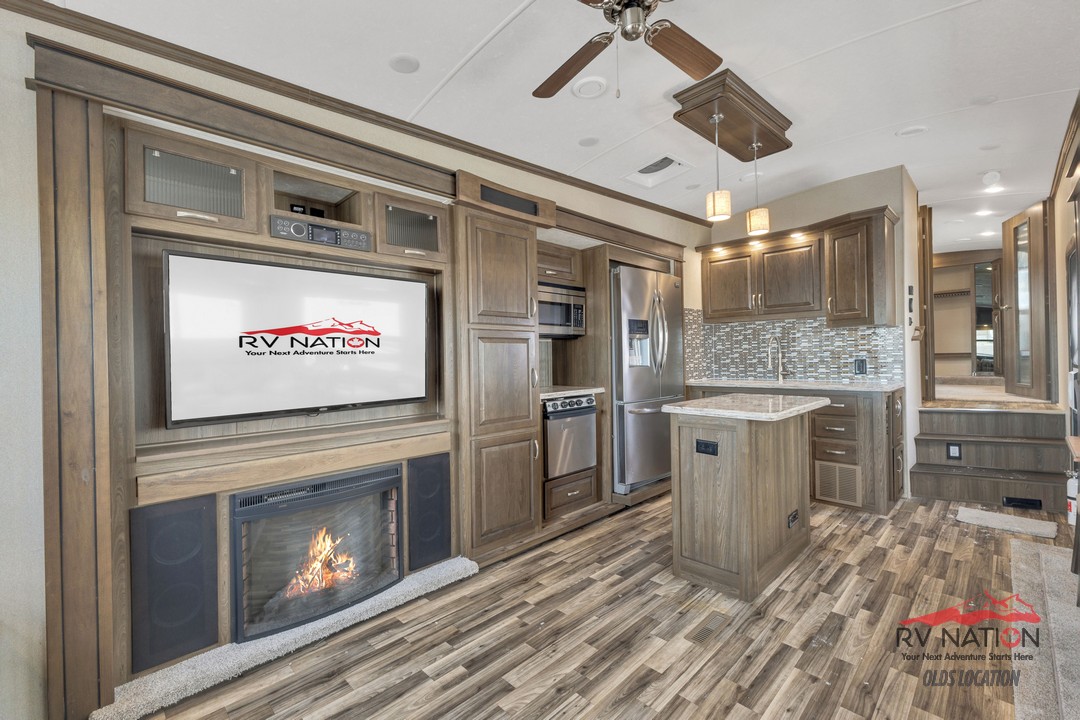 The 2016 Bay Hill 320RS is a roomy fifth wheel designed for extended travel and home-like comfort. With three slide-outs and a well-laid-out rear living area, it offers plenty of space to relax, featuring comfortable seating, abundant storage, and an open floorplan that makes everyday living feel easy. The front bedroom includes a queen bed with wardrobe space, while the central kitchen provides generous counter space, modern appliances, and thoughtful storage.