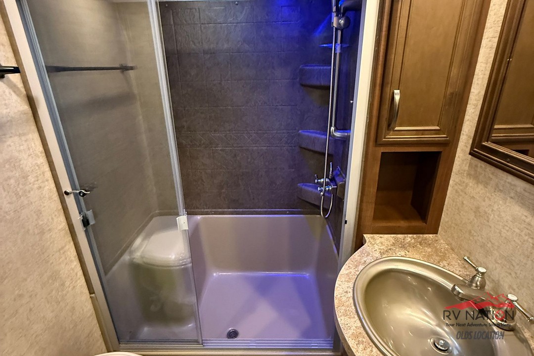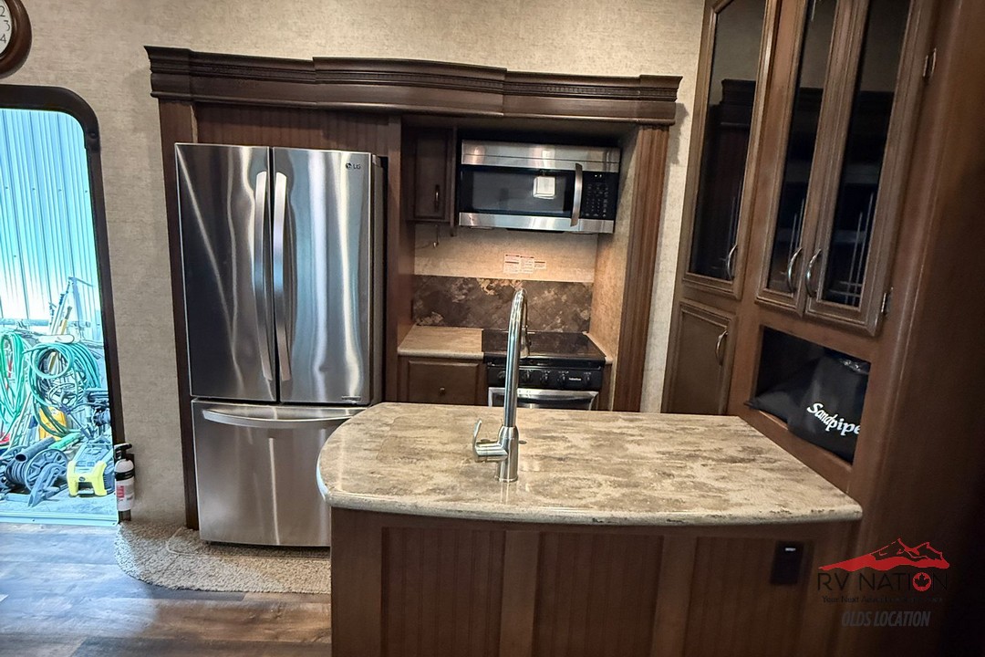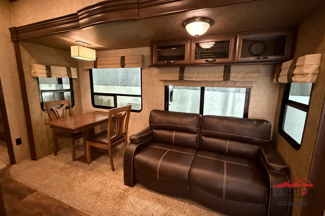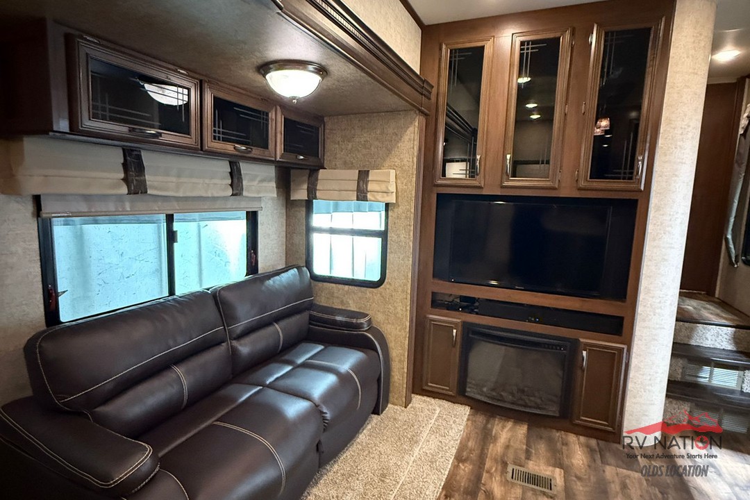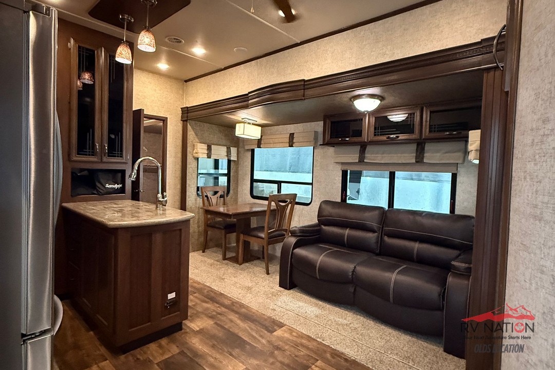 Built with durability in mind, the Sandpiper 381RBOK features a fiberglass exterior and a 16-foot power awning with LED lighting. The 15,000 BTU air conditioner and 35,000 BTU furnace ensure climate control in various weather conditions. With a fresh water capacity of 60 gallons, gray water capacity of 83 gallons, and black water capacity of 50 gallons, this RV is well-equipped for extended trips.