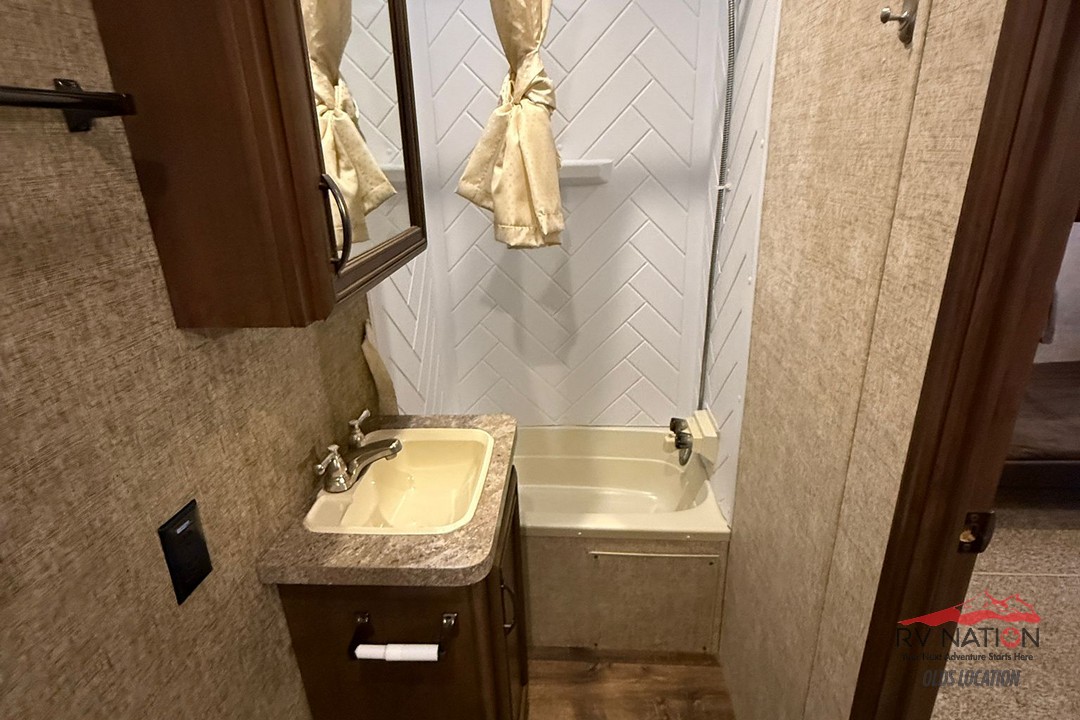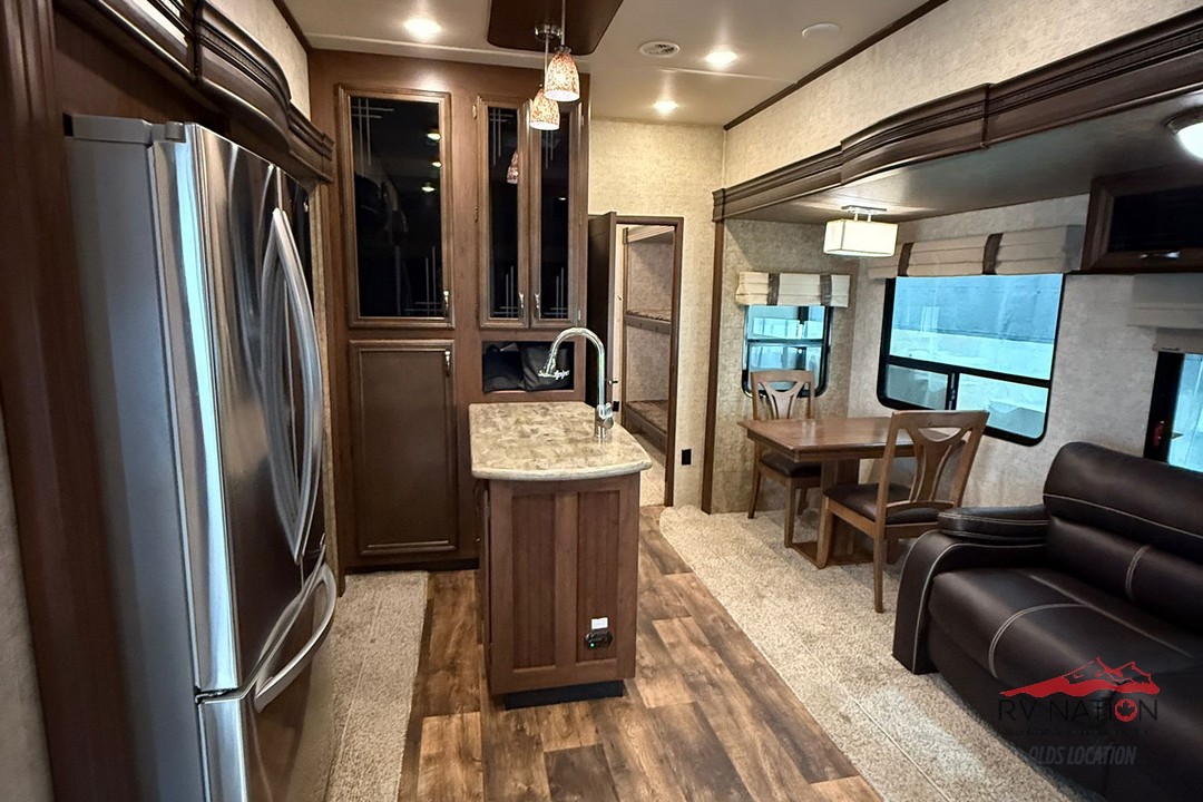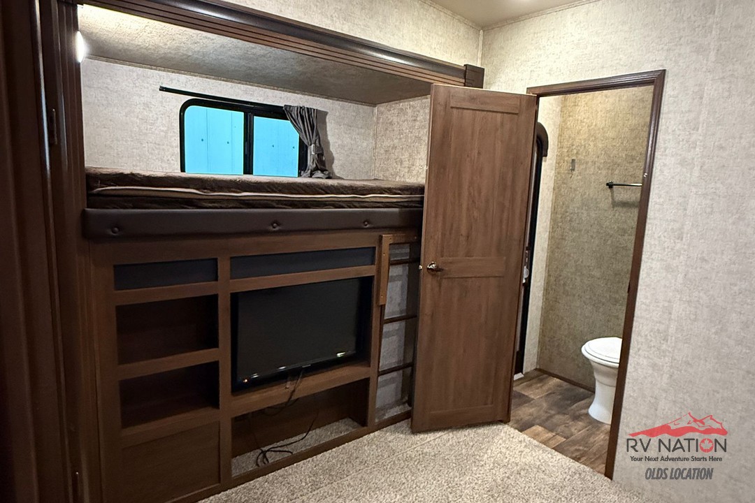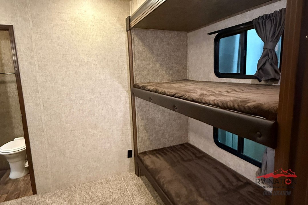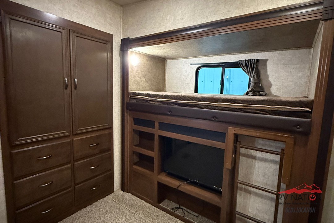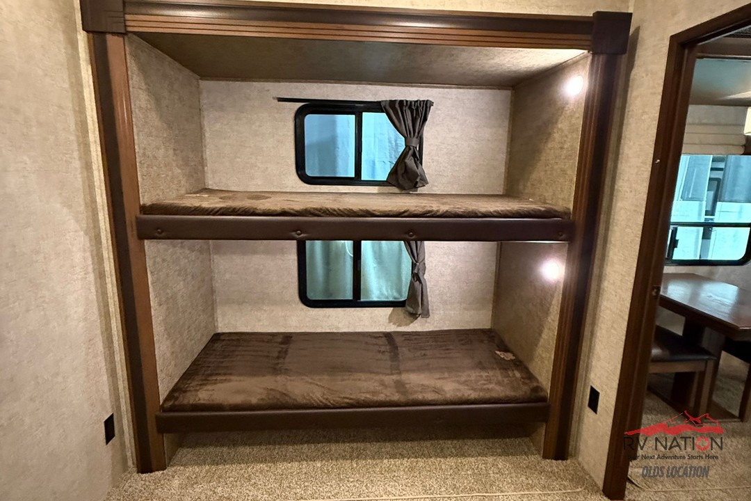 The 2016 Sandpiper 381RBOK is a luxurious fifth wheel designed for families or full-time RVers seeking ample space and comfort. With five slide-outs and a length of 42.5 feet, this RV offers a spacious interior that comfortably sleeps up to eight people. The layout includes a private rear bunkroom with its own full bathroom, making it ideal for guests or children. The master suite features a queen bed and a second full bathroom, ensuring privacy and convenience.