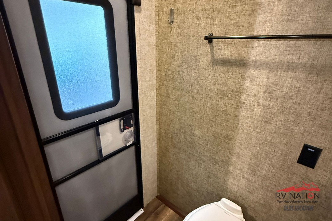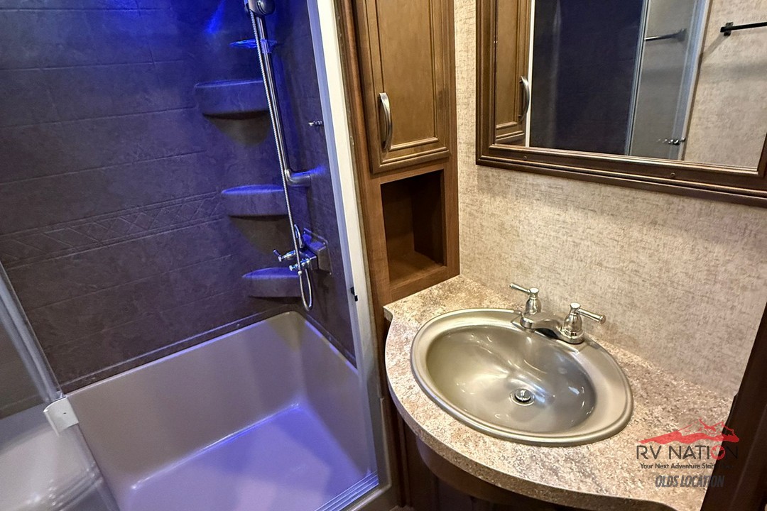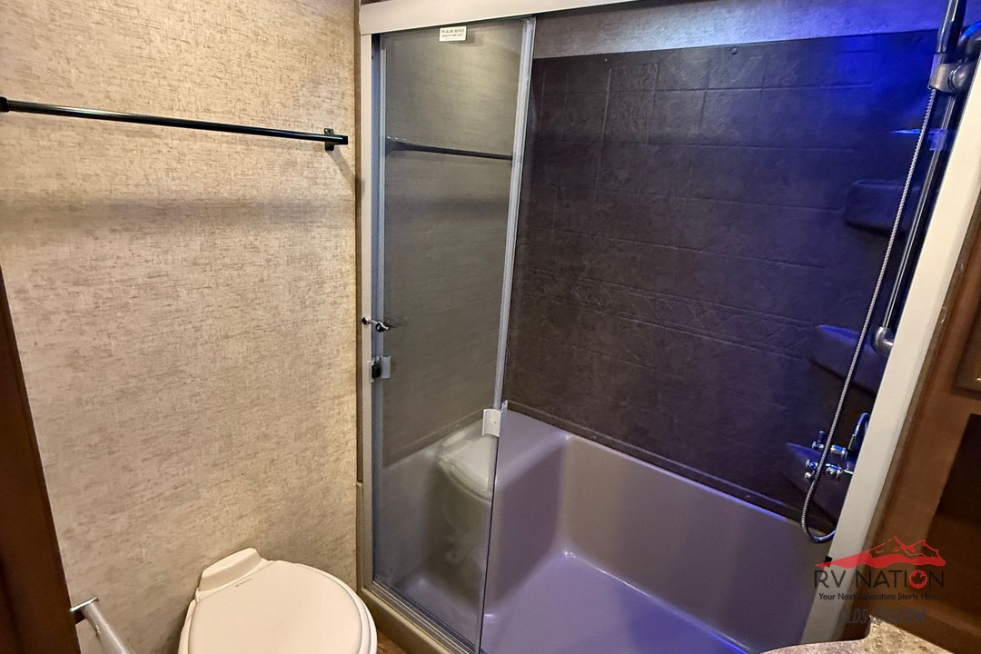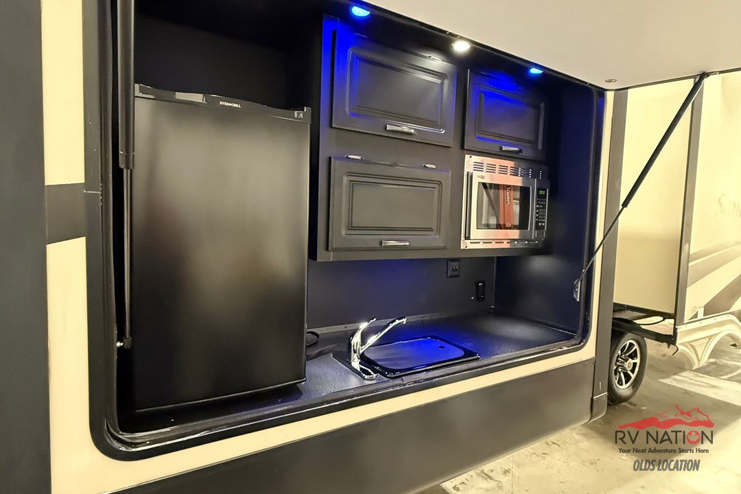 The kitchen is equipped with a three-burner stove, oven, microwave, and a 10-gallon water heater, allowing for extended off-grid stays. The living area boasts a 40-inch LED HDTV with a premium soundbar and Sony DVD player, providing entertainment options. Additionally, the RV includes a central vacuum system, washer/dryer prep, and a tri-fold hide-a-bed in the bunk slides for added comfort.