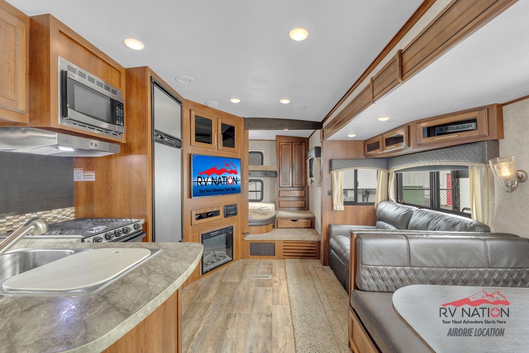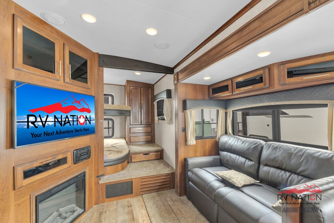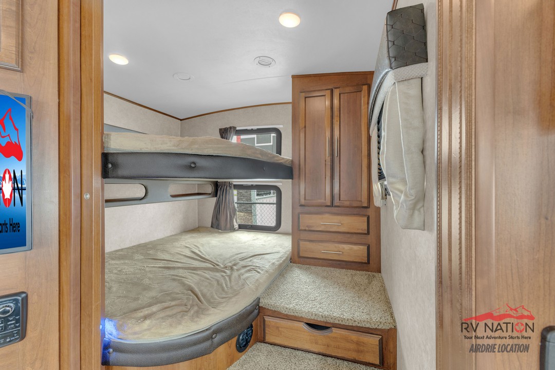 It features a rear bunkhouse with double-over-double bunks, a front queen master bedroom, and a central living area with a tri-fold sofa, booth dinette, and entertainment center. The kitchen includes a three-burner stove, microwave, and 8 cu. ft. fridge. Outside, enjoy an electric awning with LED lights and an outdoor kitchen.