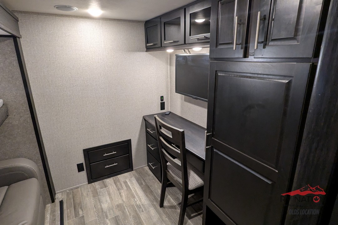 It features a front queen bedroom, mid-bunk room with loft and desk, and a rear living area with theater seating, a tri-fold sofa, and fireplace. The kitchen offers a center island, residential fridge, and large pantry for all your cooking needs.