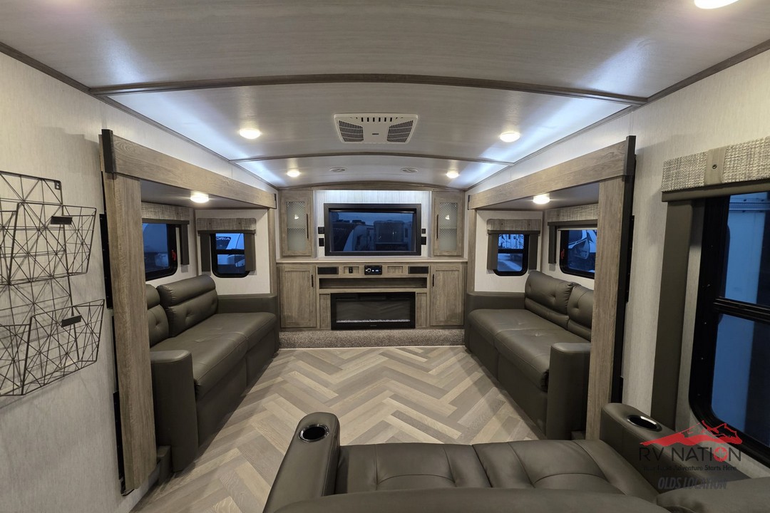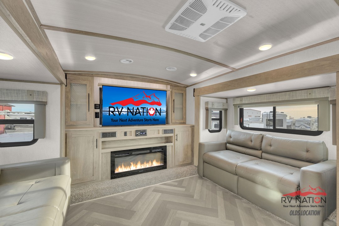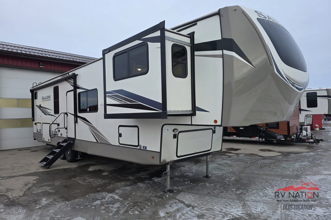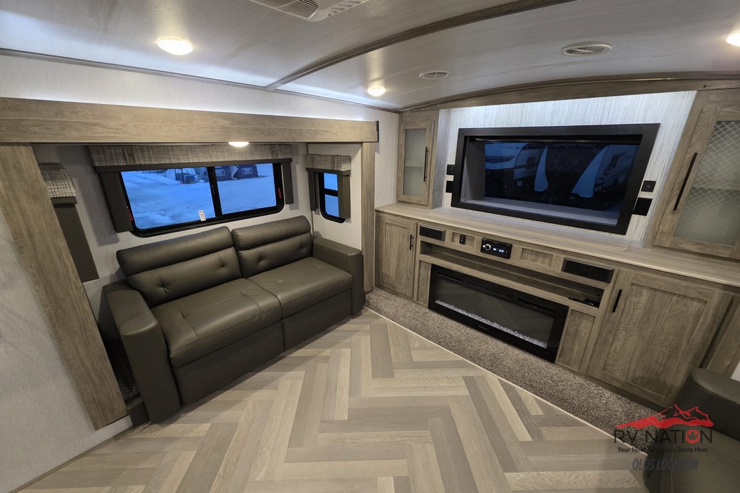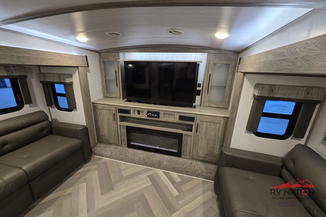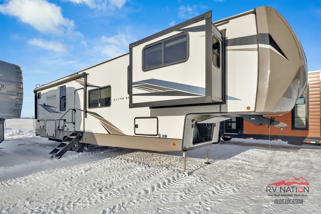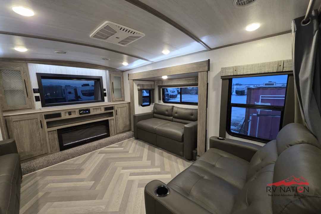 The 2022 Salem Hemisphere Elite 36FL delivers a roomy and luxurious fifth wheel experience with a front living layout that’s perfect for entertaining or relaxing after a day on the road. Its well-designed interior features large slide-outs that expand the interior space, comfortable seating, and plenty of natural light. The kitchen offers solid-surface countertops, ample cabinet storage, and modern appliances, while the entertainment center and seating area create a welcoming space for gatherings or quiet evenings.