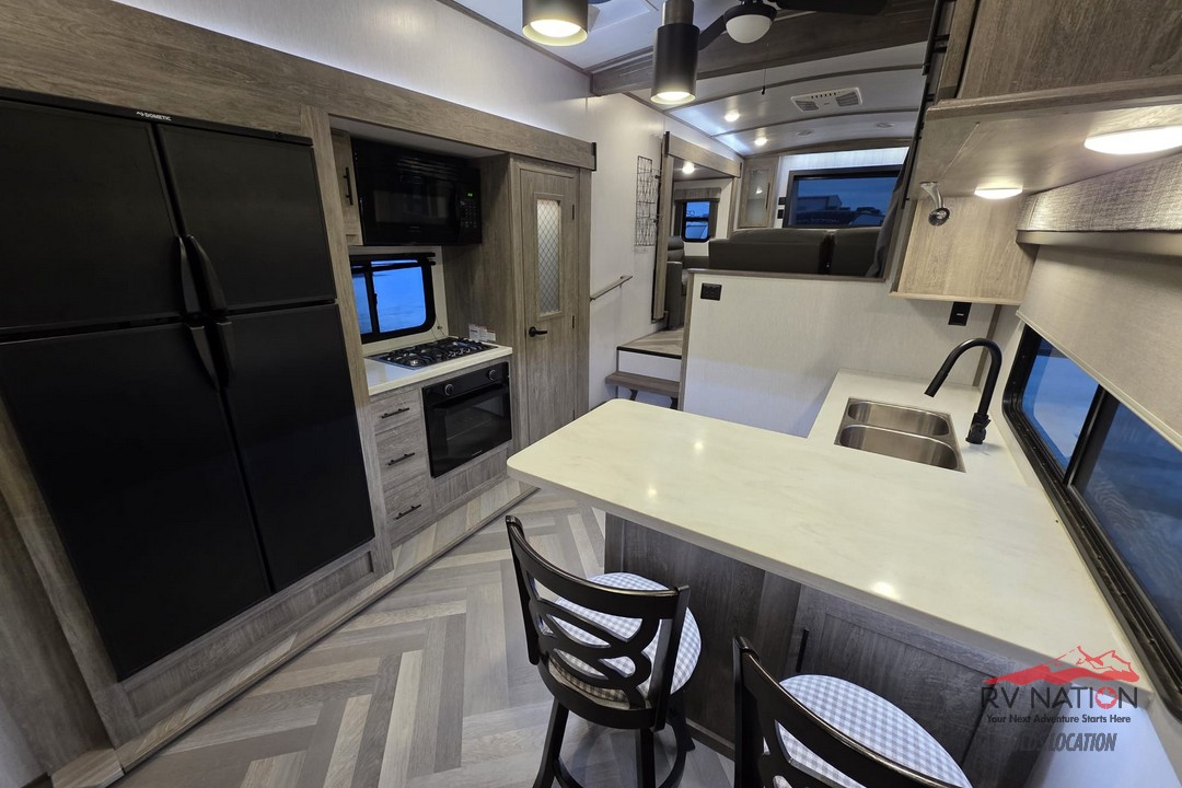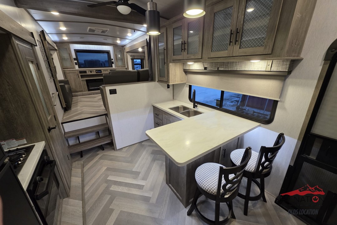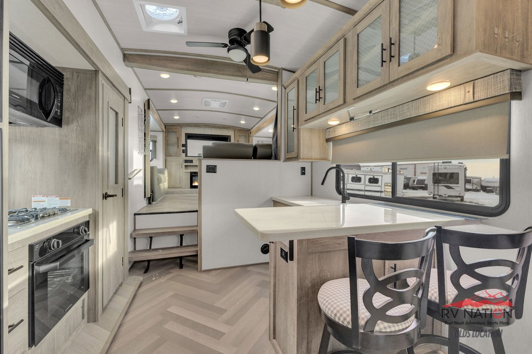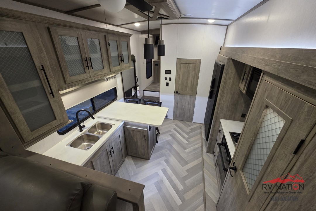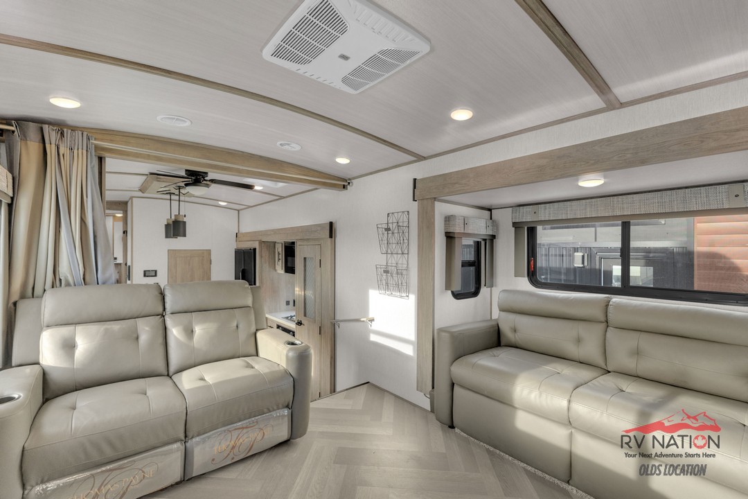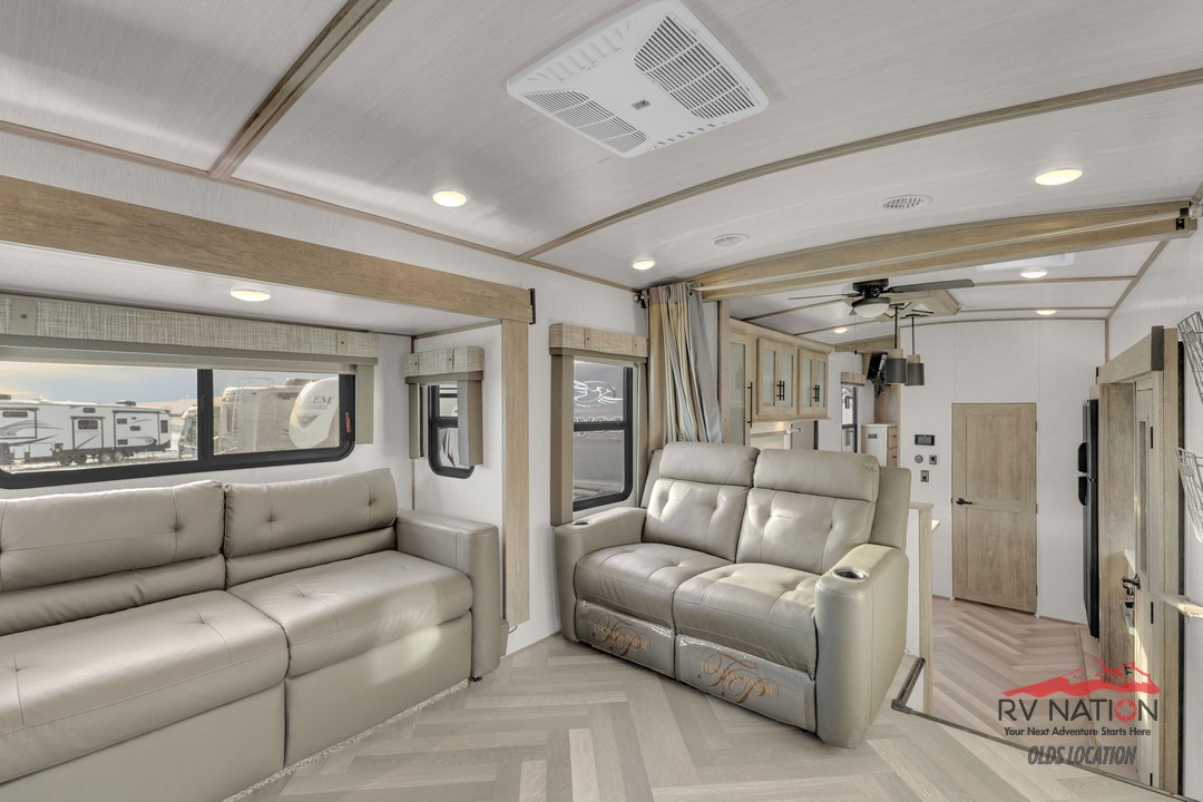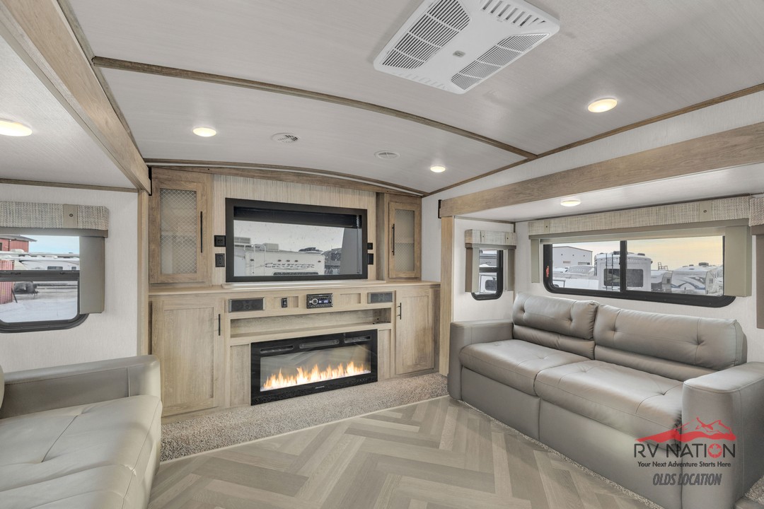 The 2022 Salem Hemisphere Elite 36FL delivers a roomy and luxurious fifth wheel experience with a front living layout that’s perfect for entertaining or relaxing after a day on the road. Its well-designed interior features large slide-outs that expand the interior space, comfortable seating, and plenty of natural light. The kitchen offers solid-surface countertops, ample cabinet storage, and modern appliances, while the entertainment center and seating area create a welcoming space for gatherings or quiet evenings.