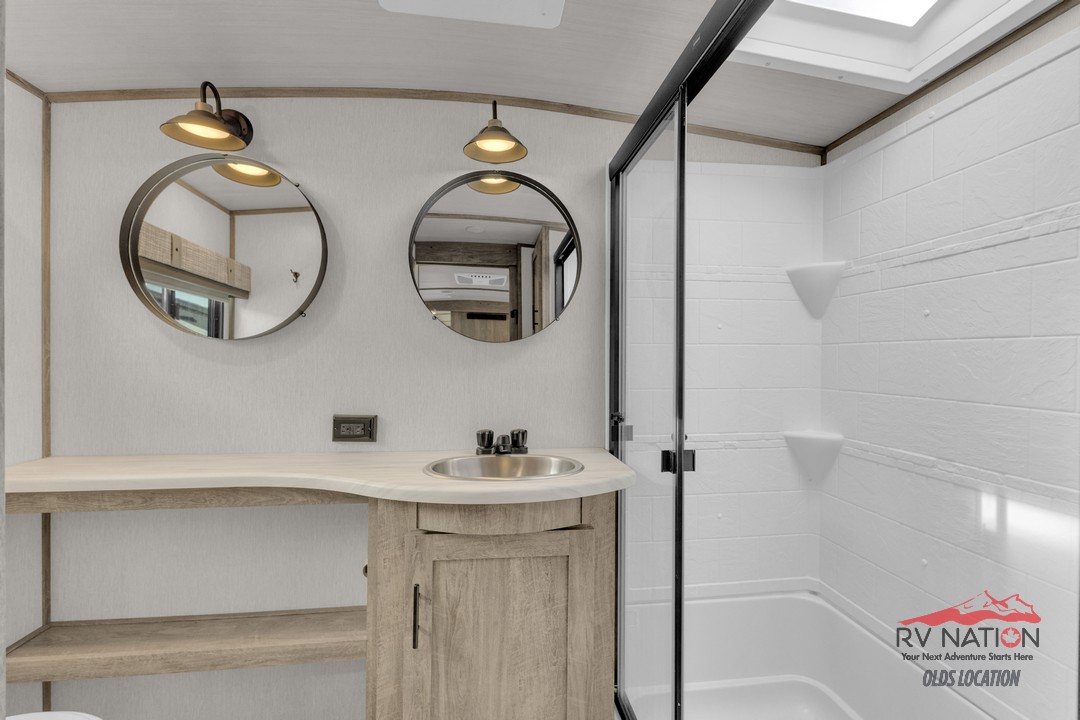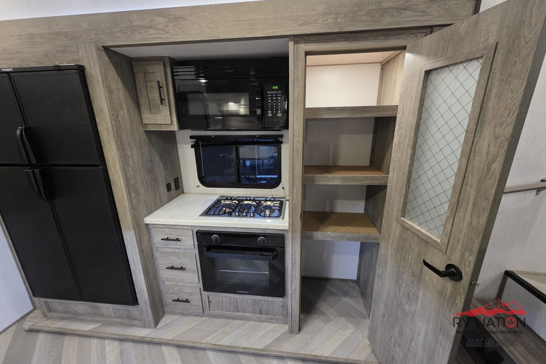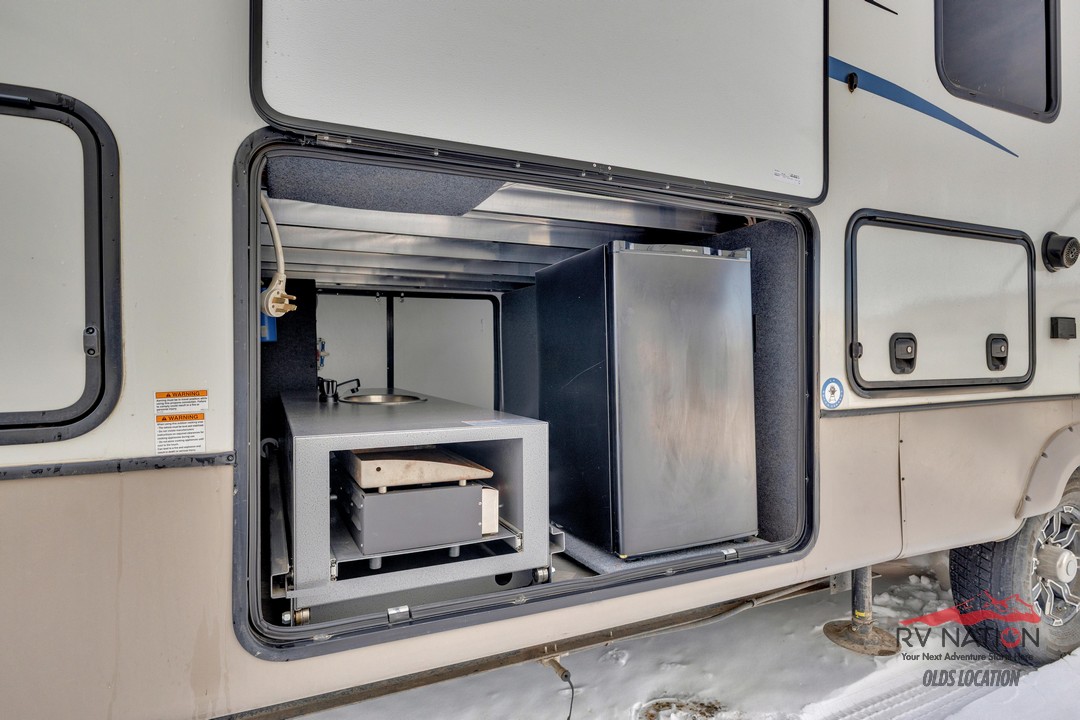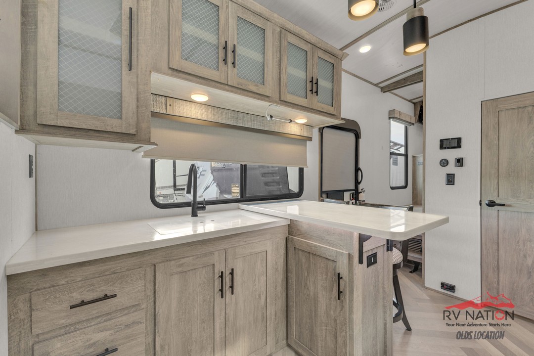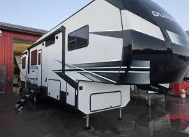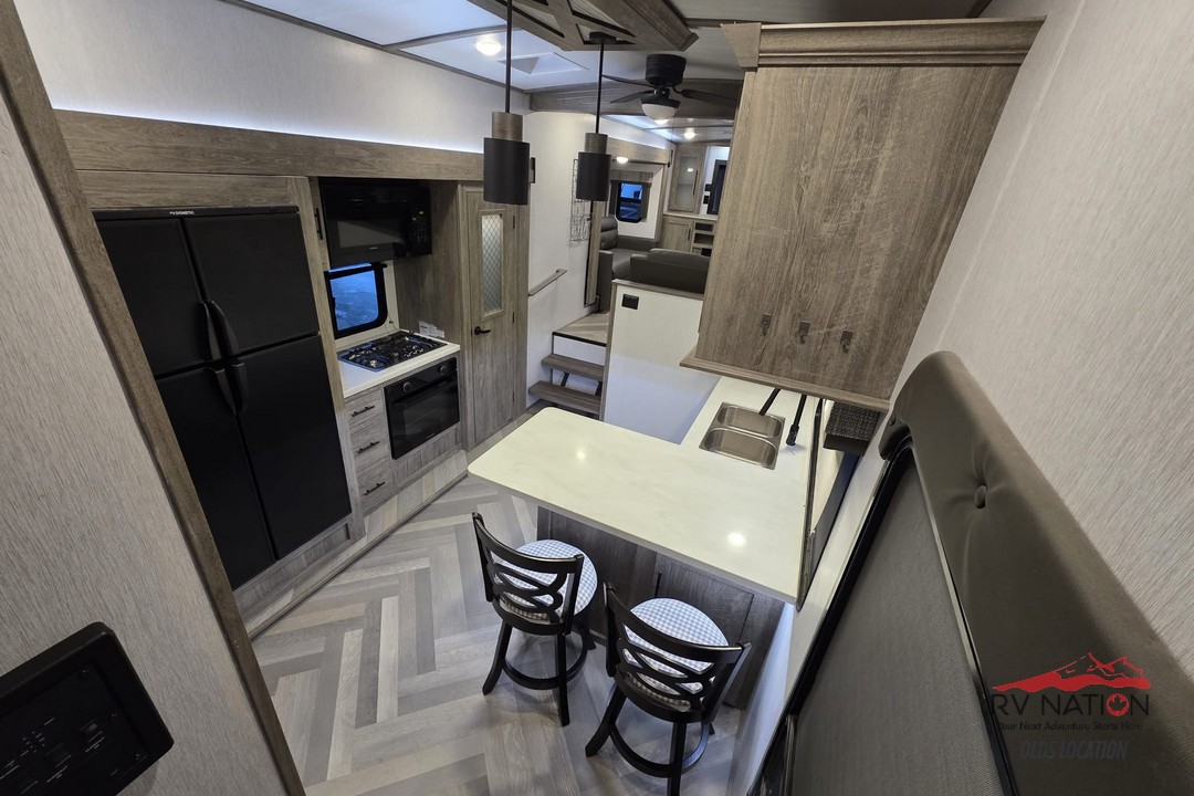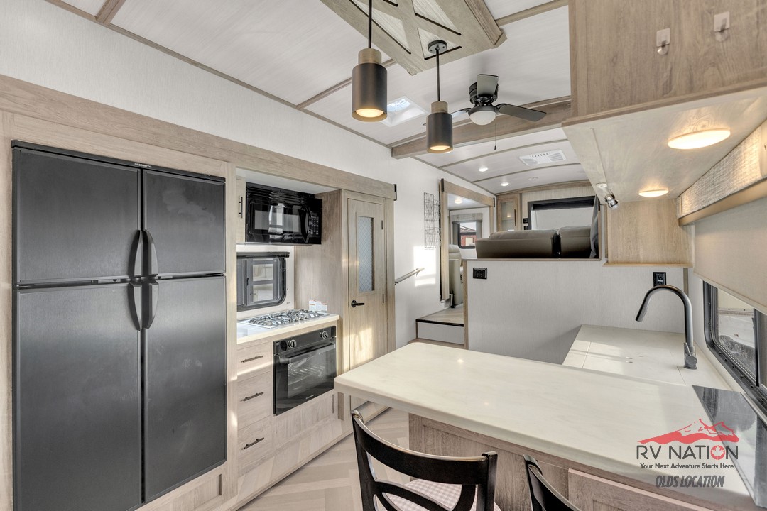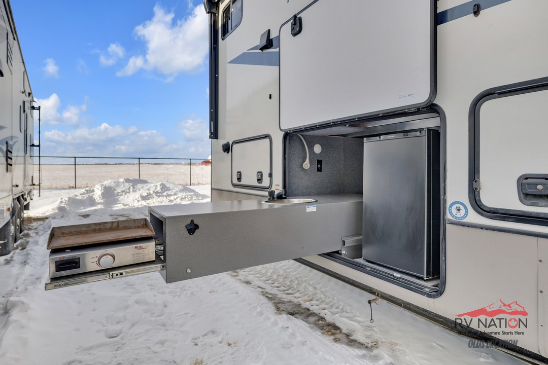 The 2022 Salem Hemisphere Elite 36FL delivers a roomy and luxurious fifth wheel experience with a front living layout that’s perfect for entertaining or relaxing after a day on the road. Its well-designed interior features large slide-outs that expand the interior space, comfortable seating, and plenty of natural light. The kitchen offers solid-surface countertops, ample cabinet storage, and modern appliances, while the entertainment center and seating area create a welcoming space for gatherings or quiet evenings.