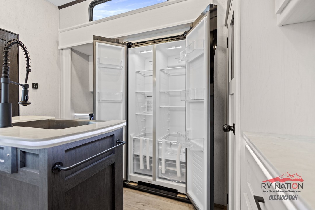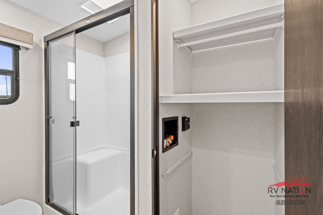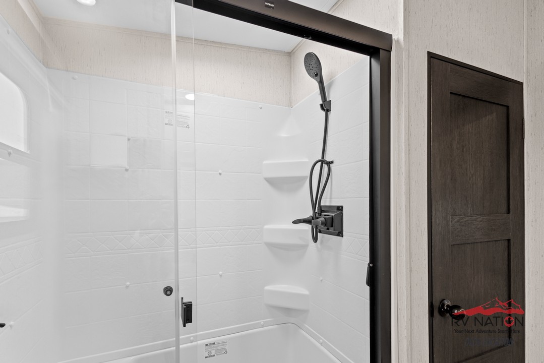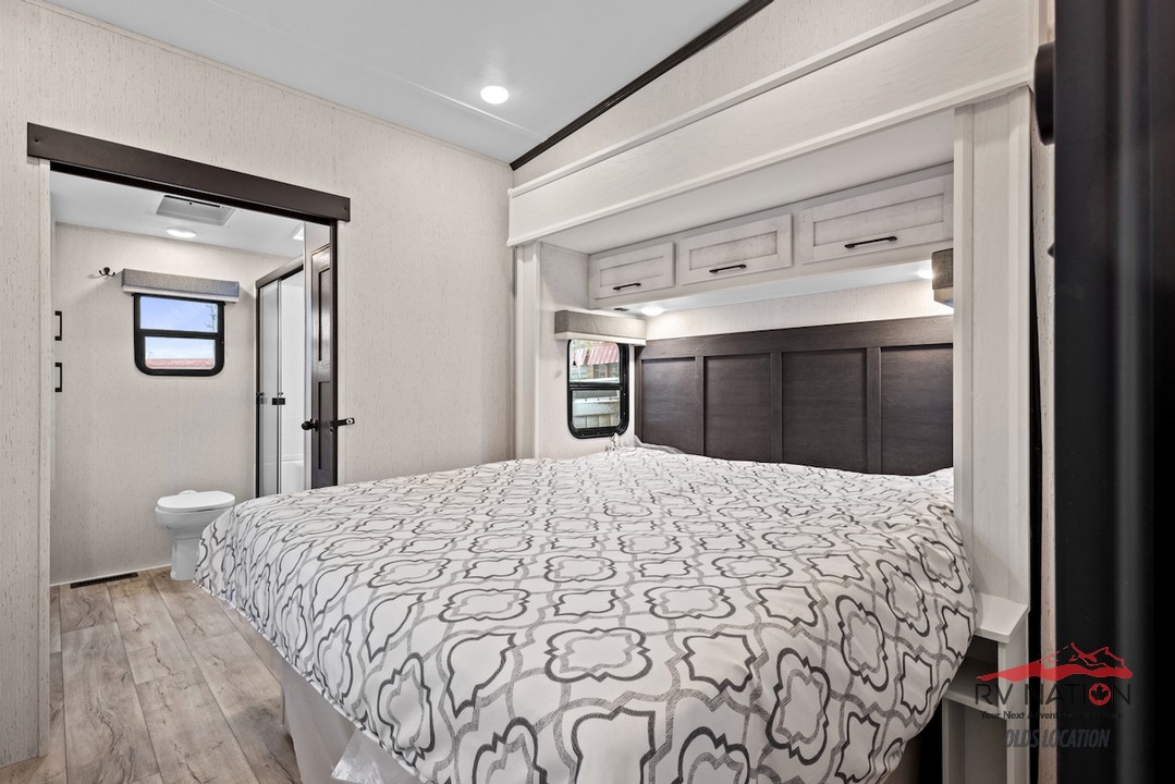The private rear bedroom offers a king bed slide, an entertainment center, and direct access to a full bathroom equipped with dual sinks, a walk-in shower, and washer/dryer prep. An additional half bath adds convenience for guests. With five slide-outs, dual power awnings, and Dutchmen's All Weather Thermal Package, the 3803FLP ensures a comfortable and stylish retreat wherever your journey takes you.