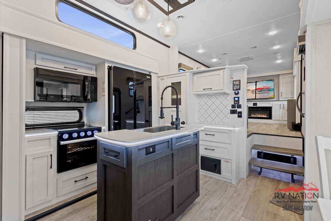 This expansive unit features a front living area with dual opposing sofas, theater seating, and a 40" glass fireplace beneath an HD LED TV, creating a cozy space for relaxation and entertainment. The central kitchen boasts a large island, stainless steel appliances, a 16 cu. ft. refrigerator, and ample storage, making meal preparation a delight.