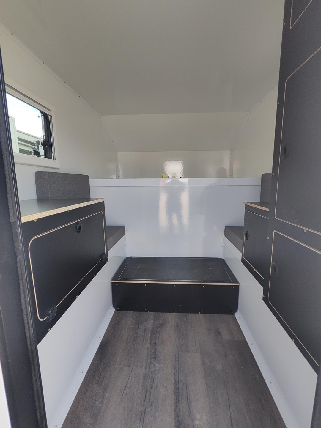 The interior offers a spacious layout with ample headroom and storage options, providing a comfortable living space on the road. Optional features include but not limited to; Manual Jacks, electric roof fan, bunk windows on both sides, cabinet options, seating and table setup, allowing customization to suit your camping needs