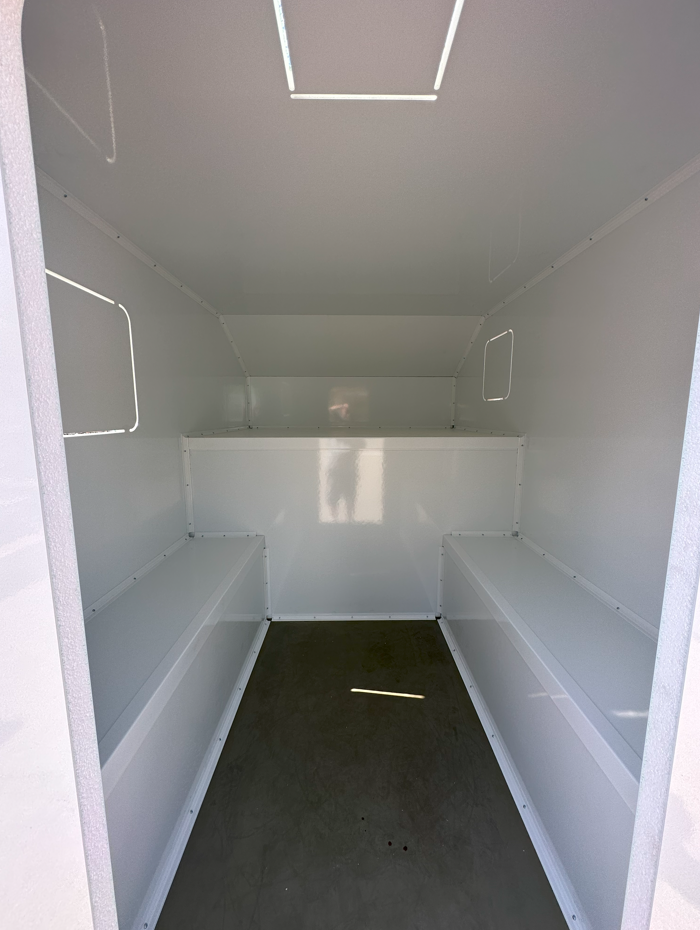 The interior offers a spacious layout with ample headroom and storage options, providing a comfortable living space on the road. Optional features include but not limited to; Manual Jacks, electric roof fan, bunk windows on both sides, cabinet options, seating and table setup, allowing customization to suit your camping needs