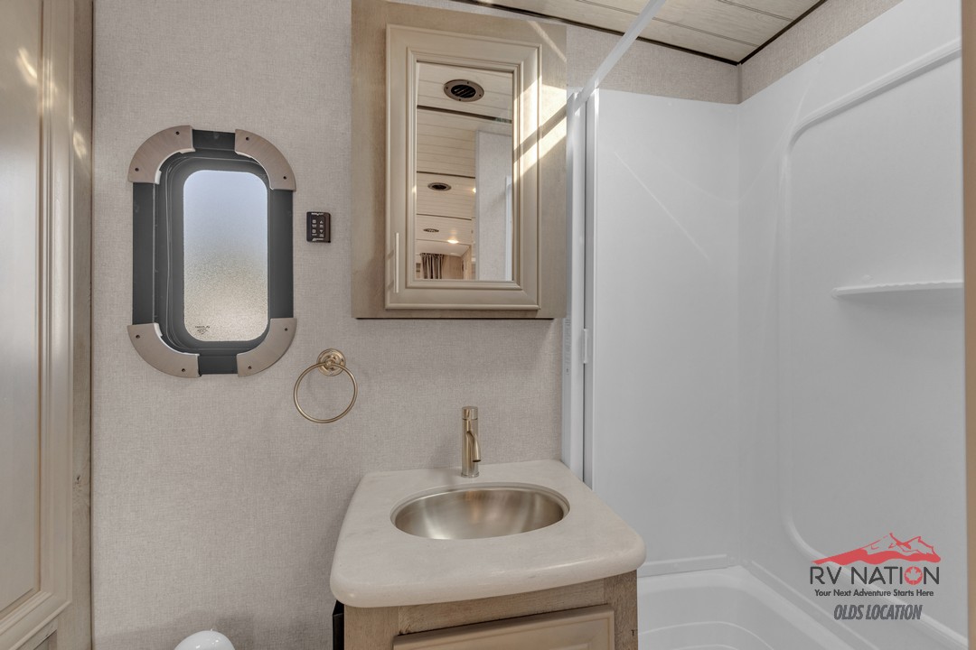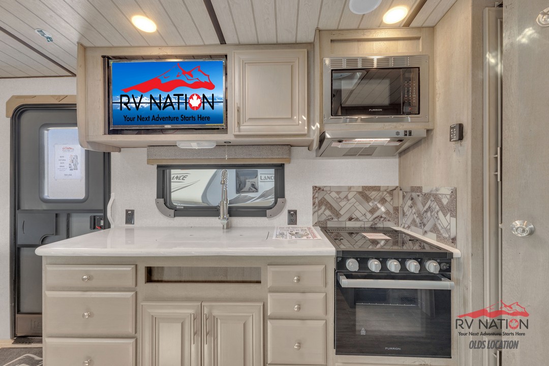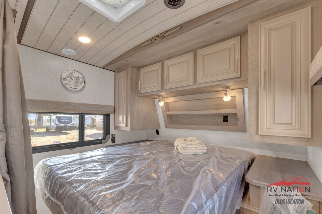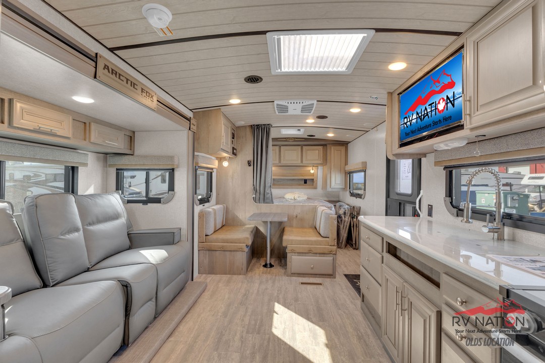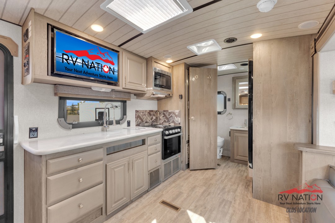Inside, you'll find a spacious rear bathroom with a glass shower enclosure, solid-surface counters, and ample storage. The main living area includes a slide with comfortable theater seating, and a mini dinette, and a fully equipped kitchen with stainless appliances and a 12V refrigerator. The front queen bed offers a cozy retreat with wardrobes, USB ports, and 110V outlets on each side.