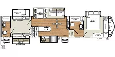 Built with durability in mind, the Sandpiper 381RBOK features a fiberglass exterior and a 16-foot power awning with LED lighting. The 15,000 BTU air conditioner and 35,000 BTU furnace ensure climate control in various weather conditions. With a fresh water capacity of 60 gallons, gray water capacity of 83 gallons, and black water capacity of 50 gallons, this RV is well-equipped for extended trips.