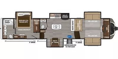 With a fresh water capacity of 66 gallons, grey and black tanks each 88 gallons, powerful heating and cooling (30,000 BTU A/C and 35,000 BTU furnace), and a solid propane setup, this unit is built for long stays and serious adventure. Built on a strong chassis with great exterior features—dual awnings, pass-through storage, and a rugged frame—this Montana delivers style, durability, and comfort for those who want more from their RV life.