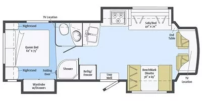 Toward the rear, the private bedroom provides a cozy bed with wardrobe storage, and the full bathroom is conveniently positioned between the living and sleeping areas. With its smart layout, quality construction, and practical amenities throughout, the Aspect 30J offers a comfortable and reliable way to travel and explore.