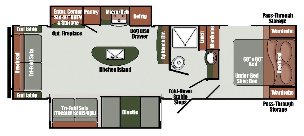 Up front, the private bedroom includes a queen bed with wardrobe storage, and the full bathroom is conveniently positioned between the living and sleeping areas. With a length of just over 34 feet and a dry weight around 7,100 lbs, the Envision 290RL balances space and towability while offering practical tank capacities and a tankless water heater for added convenience.
